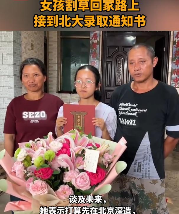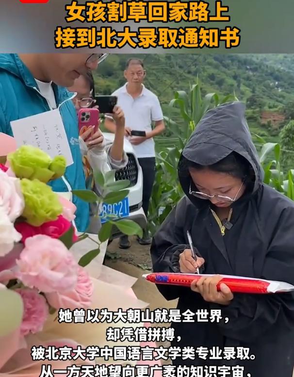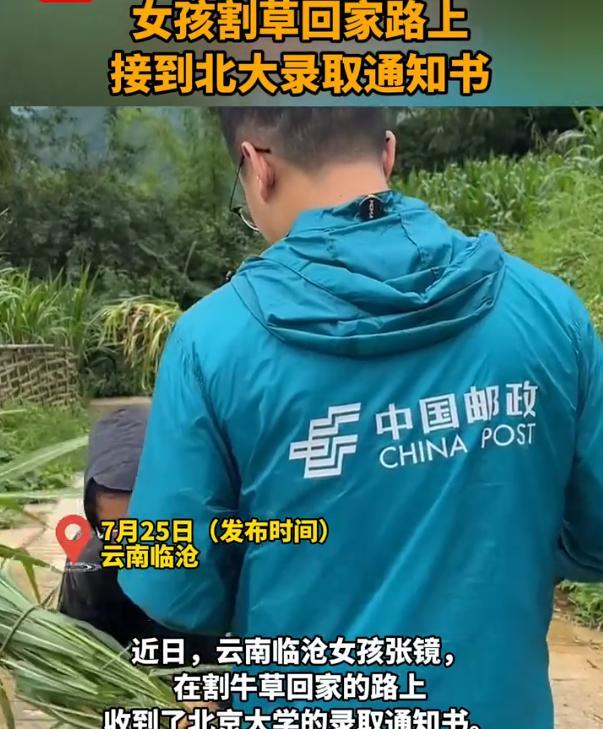 光宗耀祖了!”云南临沧,女生刚干完农活回家,正准备收拾农具,突然听到快递员在门外喊她的名字,可由于是山区,平时快递都不送到门,这次不仅送上门,还点名让她亲自来取,这让她有些意外,随后打开一看才发现是竟然是北大的录取通知书!网友:真正的寒门学子! 由于住的地方比较偏,所以快递在山区并不常见,张镜下意识以为是前阵子买的农具到了,拆开一看,整个人愣住了,是一封印着“北京大学”字样的录取通知书 她当时眼眶就红了,至少这些年的努力看到了回报,村子里的人都知道,这个小姑娘不声不响,成绩却总是年级前几名 她这次高考考了670分。语文131,外语137,数学123,文综三门也都稳稳过九十。这样的成绩在当地堪称学霸级别。但熟悉她的人都知道,这背后是她十几年如一日的坚持 最让人佩服的是,张镜从初中就立下了考北大的目标。当时很多人都觉得这孩子异想天开,一个山里娃怎么可能考上中国最好的大学?但她就是憋着一股劲,用行动证明了一切皆有可能 很多网友说,这就是寒门出贵子。其实“贵”不在于她进了哪所大学,而是她的内心早就有一束光,哪怕条件艰苦,也没让这束光熄灭 她现在进了北大,站在了全新的人生起点上,未来她会看到不一样的世界,也会让更多人看到从大山里走出来的坚定与可能 而在谈及未来时,她表示会现在北京深造,未来会回来建设家乡,我相信这样的女孩,未来一定能够成功,实现现在说出的每一句话 #女孩割草回家路上接到北大录取通知书#