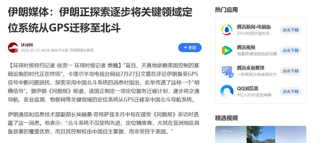 这步棋下得真够果断!伊朗媒体刚放出消息,要把交通、农业这些关键领域的定位系统,一点点从美国 GPS 换成中国北斗! 这可不是换个手机导航那么简单 —— 要知道,以前伊朗的渔船在波斯湾迷航,导弹车在冲突中突然 “失明”,全是 GPS 惹的祸。 如今这步棋,藏着对美国技术控制权的彻底不信任,更藏着找个靠谱替代者的迫切。 伊朗要把关键领域的定位服务换成了中国北斗,这事说起来全是被 GPS 逼的,把国家重要设施的导航全交给美国,就像把家门钥匙塞给别人,实在是不踏实。 在之前 12 天的冲突里,GPS 的不靠谱彻底暴露了,导弹车刚定好位,信号说没就没;波斯湾的货船好好走着,导航愣说闯了邻国海域。 更让人后背发凉的是,以色列暗杀核科学家时,用的就是手机定位 —— 谁能保证 GPS 不会变成盯着自己的 “眼睛”? 自己想办法防着点吧,结果更糟,为了防监听,伊朗有时会屏蔽部分 GPS 信号,可老百姓跟着遭殃:外卖找不着地址,救护车在市区绕圈,连开斋节朝圣的车队都走散了。 有个农场主的无人机,就因为信号断了,把一车农药全撒在了自家麦田里。 北斗的出现正好解了这个困局,最关键的是,这套系统攥在中国自己手里,不会因为国际局势变卦就掐信号。 在亚洲地区,它的定位精度比 GPS 还高,伊朗的沙漠、山地都能覆盖到,用着特别踏实。 除了定位精准之外,它用起来也格外方便,中国牌子的智能手机本来就兼容北斗,不用专门换设备。 伊朗的科技公司还搞了个自动切换功能,哪个信号好用哪个,跟家里备了双路电源似的。 在农业上帮的忙更实在,用它指导灌溉,小麦产量提高了两成,对常闹旱灾的伊朗来说太重要了。 现在伊朗的港口吊臂、电网巡检机器人,连边境巡逻队的对讲机,都悄悄换上了北斗的芯,物流公司老板算过账,换系统后货车空驶率降了 15%,一年能省出两辆新车钱。 老百姓的感受更直接,以前用 GPS,导航说 “左转” 还得琢磨是不是骗你;现在北斗说 “到了”,抬头准能看见目的地。 波斯湾的渔民也踏实了,再也没出现过坐标乱跳差点撞暗礁的事,货车在沙漠里迷路、无人机掉下来的情况也少多了。 这事儿在中东传开后,不少国家都动了心思,卡塔尔半岛电视台说得明白,谁也不想在导航上被人卡脖子。对任何国家来说,选个靠谱的工具比啥都重要,北斗就是这样的存在。