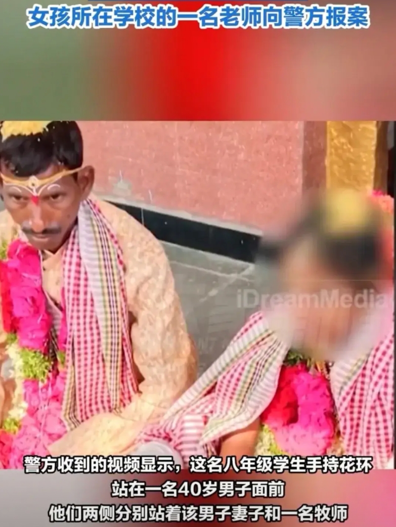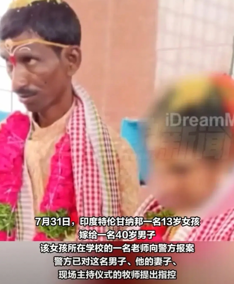 7月31日,印度特伦甘纳邦曝出一桩令人震惊的童婚案,一名13岁的八年级女学生被迫嫁给40岁男子斯里尼瓦斯·高德(Srinivas Goud),而这场荒唐婚礼的见证人竟是新郎的原配妻子和一名牧师。