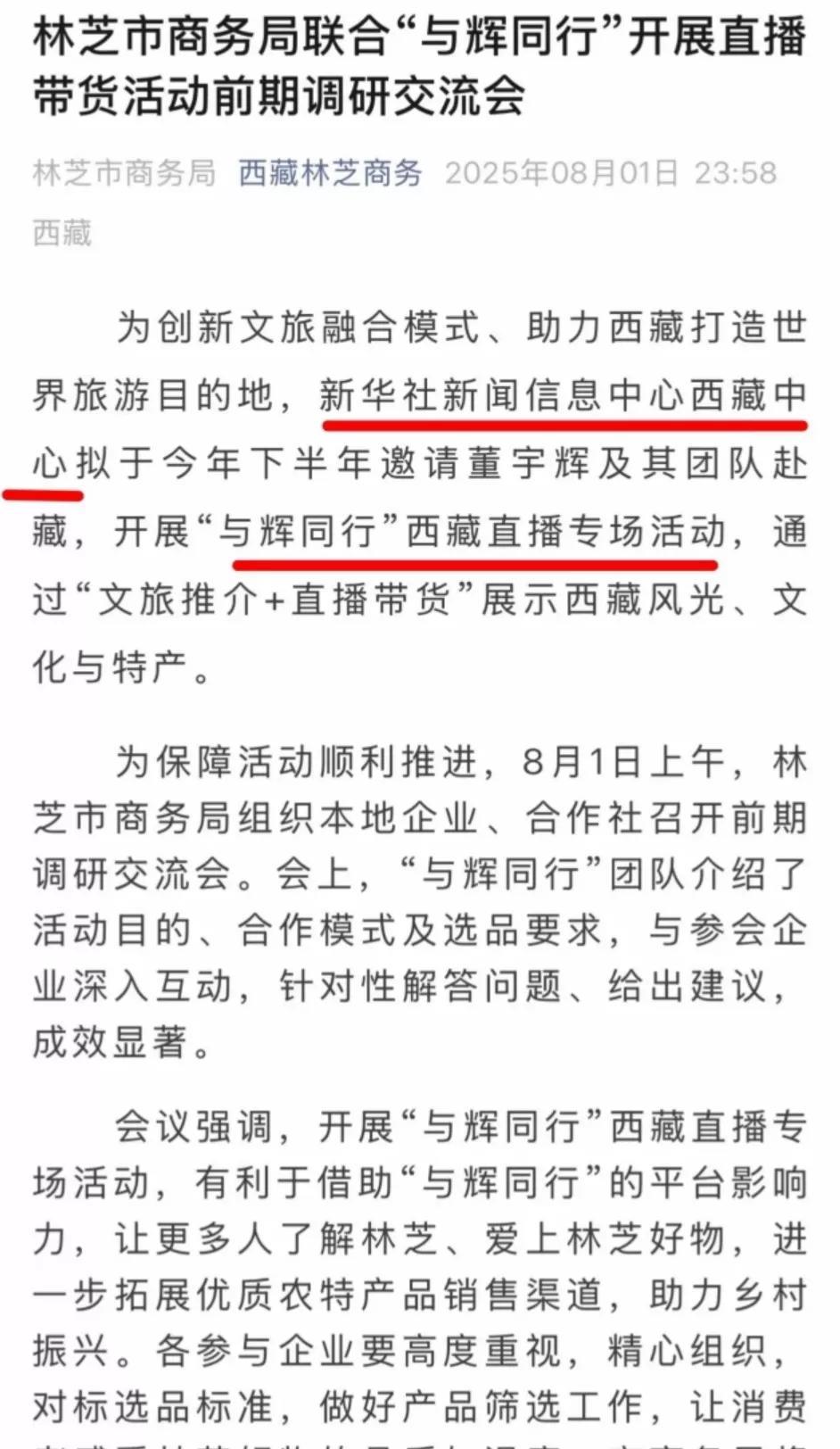西藏林芝迫不及待了,已经开会研讨,关于与辉同行阅山河传来三条重要消息。 1,今年下半年,新华社西藏新闻中心邀请董宇辉及其团队赴藏,通过文旅推介、直播带货,展示西藏人文、特色好物。 2,8月1日上午,与辉同行派团队到了现场开会,介绍了活动目的、选品要求,并针对性的解决回答商家的问题,给出建议。 3,林芝当地非常重视,希望借助与辉同行,让更多人了解、认识、喜欢上林芝。 其中特别提到,要求当地企业认真选品,积极参与,高标准、严筛选,保证产品质量,让消费者感受到林芝的品质和温度。 有朋友说,看来西藏是真急了,刚开会研讨就开始宣传了。 记得董宇辉说过,如果一切顺利,阅山河大概准备60天,那么九月底可能就去了,大家敬请期待吧。 #董宇辉# #头号创作者激励计划#
