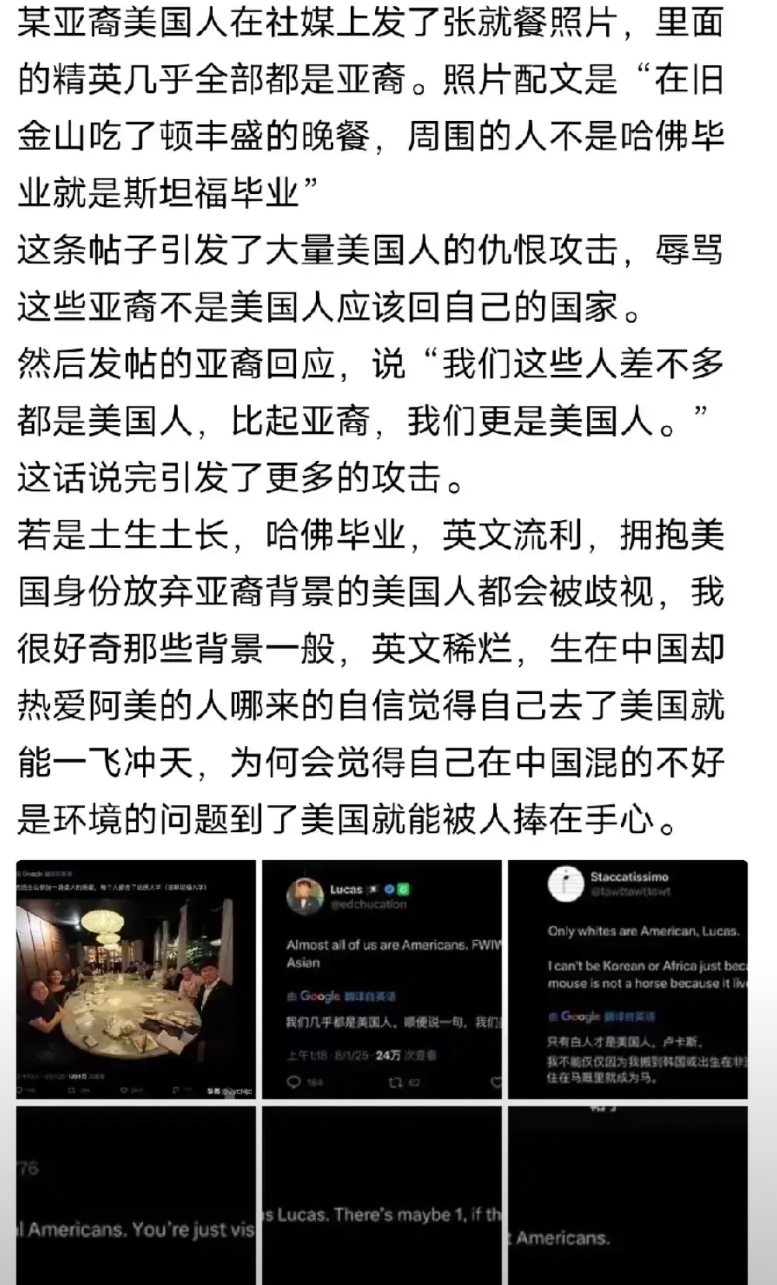 美国华裔为中国血统感到羞耻,难怪华人在美国地位那么低,华人自己都看贬华人血统这个标签,美国人找了几个华裔和第一代移民去美国的华人做节目,节目的内容居然是讨论它们作为美国华裔和华人,会不会因为自己的中国血统而感到羞耻,这些人顶着一张华人的脸,模仿着美国人的坐相,说着美式口音的英语,用美国人的思维逻辑讨论着它们的中国血统,而且还是会不会为此感到羞耻。 我要是美国人,我也鄙视这样的族群,所以不要老是说美国人种族歧视,实在是华人自己作的,另外一个事情是一群美国常青藤大学毕业的亚裔,也是大部分是华人,聚在一起派对,然后晒图说自己是美国人,比美国人还美国人,比美国人还爱美国,结果评论区疯狂地讨伐它们,让它们回自己的国家,说亚洲永远成为不了美国人。 然后这些亚裔疯狂跟美国人解释,自己不认为自己是亚洲人,自己是美国人,而且比美国人还爱美国人!所以华人或者亚裔越是想脱离自己血统的标签去融入美国,最后越被美国人看不起!换我们是美国,我也看不起这样华人或者亚裔,背叛自己的血统,否认自己的血统,甚至贬低自己的血统,哪个正常的民族会接纳一群叛徒呢!