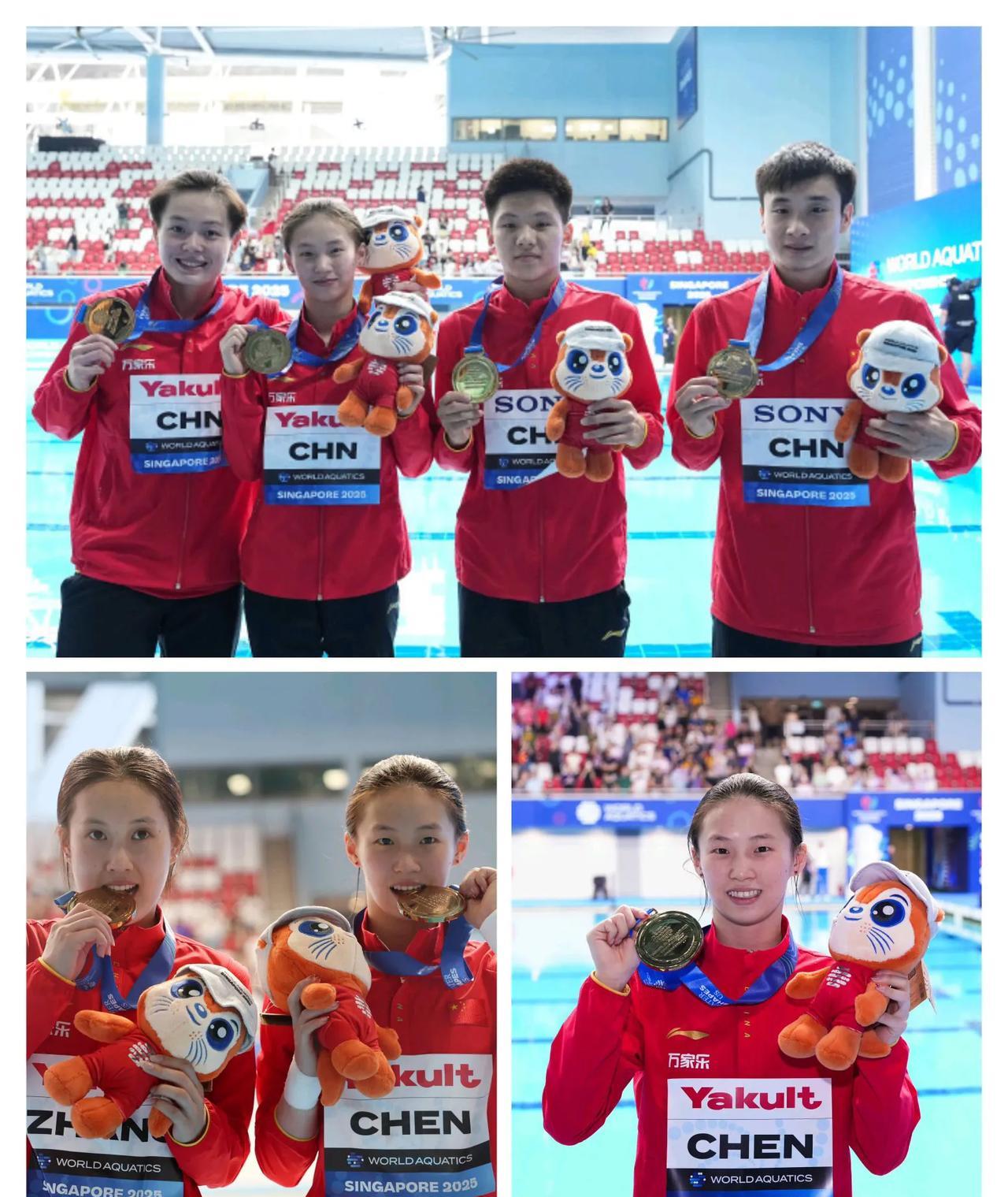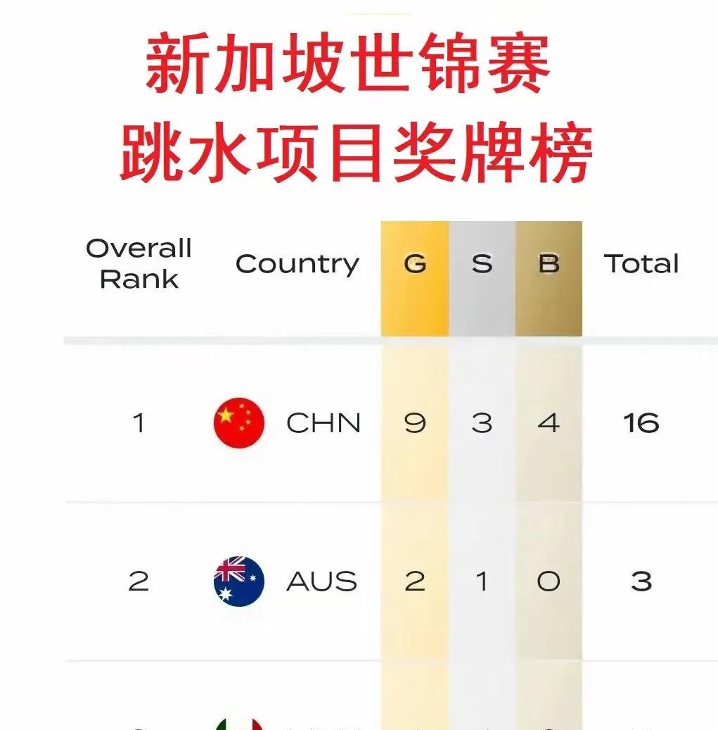 中国跳水队世锦赛奖牌第一,共收获9金3银4铜。 陈芋汐一人获三金,女子十米台一金、女子双人十米台一金、混合团体一金。 陈艺文一人获三金,女子三米板一金、女子双人十米板一金、混和团体一金。 郑九源一人获二金,男子一米板一金、男子双人三米板一金。 程子龙一人获二金,男子双人十米台一金、混合团体一金。 谢佩玲、朱勇鑫、掌敏洁、朱子峰、曹缘、陈佳、王宗源各一枚金牌。 陈芋汐和陈艺文成最大赢家,双陈共收获六枚金牌。 中国跳水队共斩获16枚奖牌,重现中国梦之队辉煌。 图片来自网络侵权可删。 #头号创作者激励计划#