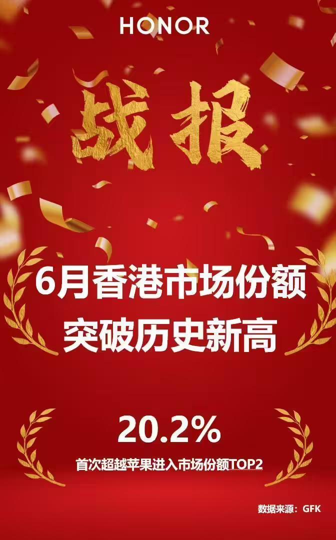 荣耀现在真是多点开花 1、6月份荣耀在香港市场份额创新高,达到20.2%。且这个成绩是超越苹果获得的; 2、荣耀已经成为香港市场Top2的品牌,那肯定是排名第二了。要是排名第一就直接说是冠军了; 3、这个战报是来自荣耀东南亚业务部。 PS:近一段时间的荣耀真的是好起来了,不仅海外多点开花。国内市场也起来了。