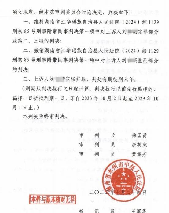 湖南90后医生强奸2名未满14周岁幼女,一审被判8年,二审却改判6年,赔偿286元。得知该医生父亲的身份后,幼女家属绝望了。 2023年9月21日,一个再普通不过的夜晚,13岁来某某却迟迟未归,母亲放心不下,四处打听孩子的去处,却都无功而返。 母亲焦急万分,颤抖着翻开女儿手机,手机里暧昧的聊天记录和XX酒店的定位信息彻底让她崩溃不已。 这揪心的一幕就真实发生在湖南江华县某小镇。 母亲连夜将幼女“救”回来后得知,女儿与医生刘某赟是在网上认识的,对方是隔壁县蓝山县某镇卫生院的医生。 眼瞅着女儿心情一天比一天差,身体愈发瘦弱憔悴,母亲的心都要碎了。 她收集了相关证据,并咨询律师后,带着女儿走进了江华县公安局,控诉刘某赟的强奸罪行。 然而,对方只承认与女儿在酒店过夜,但却辩称并没有发生性行为,只是和衣分床而睡。 母亲早已料到对方会耍赖,她带着当天给女儿在人民医院诊断的“处女膜陈旧性裂伤”结果,移交给了警方。 警方进一步调查发现,医生刘某赟并非首次“犯案”。早在2022 - 2023年期间,其就与未满14周岁幼女廖某某发生过3次性关系。 然而,庭审之际,辩护人刘志军(刘某赟之父)辩称,其子刘某赟是未婚青年,与来某某为只是“网恋”关系,现有的证据实在无法判定其犯了强奸罪。 对此,江华县人民法院坚定宣称,被指控的犯罪事实清晰可辨,证据确凿而充分,被告人的行径已然构成强奸罪。 之后,一则“湖南永州蓝山县检察官实名举报永州江华XX县公检法部分公职人员违法”的视频,彻底推翻了之前的审理结果。 而发布这则视频的男子,正是刘某赟的父亲刘志军,他是湖南永州蓝山县在职三级高级检察官,已从事监察工作30年。 他控告江华县当地派出所工作人员蓄意捏造事实,诬告陷害其子,勾结社会不法分子,错误立案、抓捕,甚至错误移送审查起诉。 然而,诡异的是,当记者联系当地人民检察院时,有相关同事表示,“那个视频他已经自愿撤回,不再举报。” 其间发生了何事?为何短短数日之内,刘志军便主动撤回? 二审结果一出,刑期从8年改判为6年。其理由为:未采用暴力、威胁等恶劣手段,亦未造成严重后果,所有的疑问早已昭然若揭。 法院的同步录音录像竟恰好有四次无声,而辨认的刘某赟照片,系统“恰巧”抓取的是其16岁时的旧照。 诸多“巧合”实在令人疑惑丛生。倘若被告父亲并非司法系统之人,证据链怎会出现如此多的漏洞呢? 试问,此案中二审的审判结果经得起法理与人心的双重检验吗? 作者:妮子 参考资料:《“90后”医生因强奸2名未成年女孩被判6年,其父亲担任辩护人》 2025-08-06 澎湃新闻