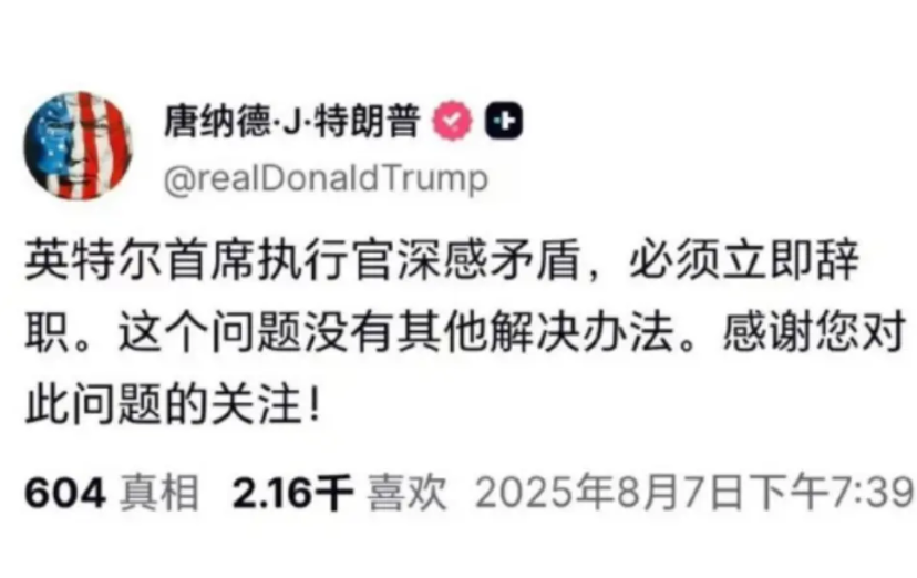 8月7日,特朗普在社交平台上发文,点名要求英特尔公司的CEO陈立武立即辞职。他给出的理由是,陈立武作为华裔高管,过去存在“与中国企业的可疑联系”,可能危害美国国家安全。