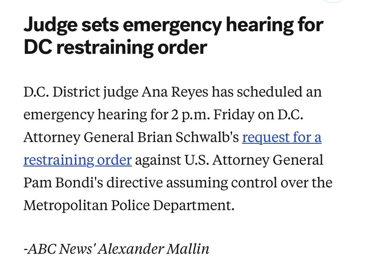 美国法官为华盛顿特区DC限制令设置了紧急听证会 华盛顿特区地区法官Ana Reyes已安排在下午2点举行紧急听证会。周五在华盛顿特区总检察长布莱恩·施瓦尔布要求对美国司法部长帕姆·邦迪(Pam Bondi)指示接管大都会警察局发出限制令。 DC寻求临时限制令,以阻止邦迪罢免警察局长 该市周五提交了临时限制令请求,寻求阻止美国司法部长帕姆·邦迪下令罢免大都会警察局长帕梅拉·史密斯。 文件称:“邦迪命令违反了《行政程序法》,因为它违反了法律,超出了机构被告的法定权力,武断和反复无常,滥用了自由裁量权,否则不符合法律。” 该文件还断言,“被告的行为也超出了他们在华盛顿特区的权力。《地方自治法》违反了《宪法》的三权分立、“小心”条款和地区条款。” 华盛顿特区警察局长:从未见过比邦迪的“危险”指令对法律和秩序的“更大的威胁” 总检察长Pam Bondi的指令主张控制华盛顿特区。大都会警察局长Pam Smith在一份寻求对政府发出紧急限制令的特别文件中表示,大都会警察局“将推翻华盛顿警察部队的指挥结构”,“危及公众和执法人员的安全”。