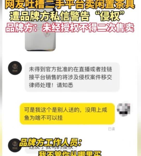 福建,一男子收拾房间时发现一套崭新的茶具,可因为用不上便将其挂在二手平台上等待有缘人,未曾想居然收到品牌方的警告:侵权,对方扬言自己只是卖了出去,并不是出售了二次销售的权利,未经过同意就是违法的!网友:你这牌子敢露名字吗?立刻就让你干不下去! 福建的王大哥在打扫屋子时,翻出一套全新的名牌茶具,因为用不着,就打算放到二手市场上卖掉。结果,他没想到这一举动竟然惹上了麻烦,被品牌方警告说这样做“侵权”了。 王大哥原本只是想收拾下屋子,还想给女朋友一个惊喜,哪知道这套没用过的茶具会带来这么大的风波。他把茶具挂到二手平台上后,收到一个说是“梵汝山房”品牌的人发来的消息,那人语气挺冲,说王大哥这样做侵犯了他们的权益,还发了张“起诉书照片”,说要追究责任。 品牌方说,他们只卖了商品,没卖“再卖一次的权利”,王大哥没经过他们同意就转卖,是违法的。这话一出,网友们都炸了锅,纷纷问:“东西卖出去了,难道还不归买家管?”“头一回听说二手转个手还能被告。”说白了,王先生卖东西的时候已经写清楚了是“用过的闲置物品”,茶具也是真货,没造假也没给牌子丢脸。按法律规定,买了东西就是自己的,想怎么处理都行。品牌说他们有“不让再卖”的权利,但这在法律上根本站不住脚。 网友们都说,品牌这是“小题大做”,不光让消费者心寒,还可能害了自己。果然,这事儿一闹大,那个牌子的茶具在二手网上到处都是,价格低得吓人,还有人开玩笑说“一分钱还包邮”,大家都是用行动来表示不满。 到现在,品牌那边还没说啥新话,但网上的风向已经对“梵汝山房”很不利了。这事儿也给所有品牌提了个醒:要想在市场上站稳脚跟,靠的不是霸道控制,而是大家的信任。