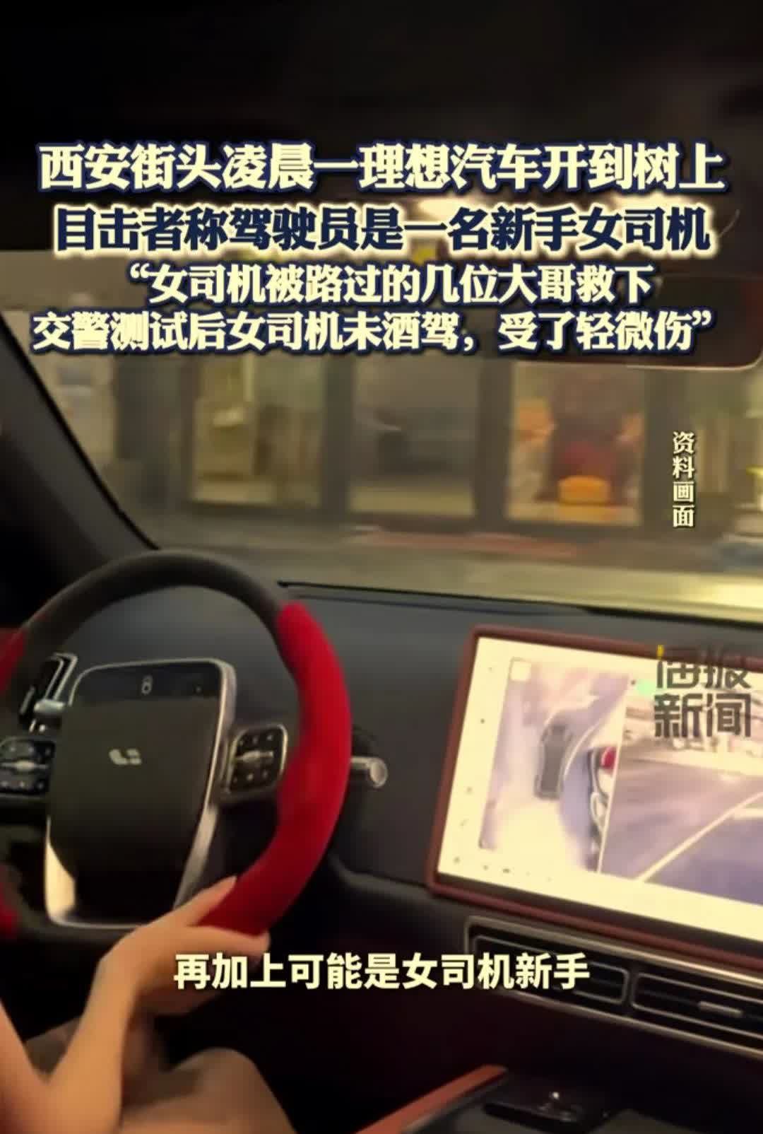 在西安,8月15日凌晨1点半左右,一女子将一辆新车理想L9开到了树上。 一目击者说:大概一点半左右发生的事故,女司机是个新手,可能开车的时候走神了。 事故刚发生,她在那边看到的时候,交警和救护车还没有到,后面交警到了也给女司机测酒精了,排除了酒驾,应该是走神了。 女司机受了轻微伤,下车的时候都是被几个大哥扶下来的。 来源:海报新闻