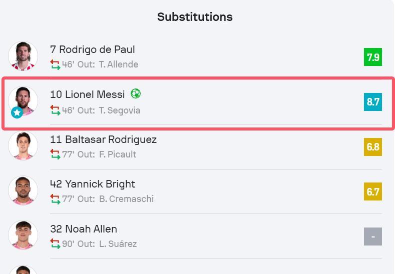 梅西替补造2球才8.7分,生涯进875球+389次助攻! 在对阵洛杉矶银河的比赛中,梅西在下半场替补出场,结果在比赛结束前,短短5分钟之内,梅西打进1球+送出1次助攻,个人独造2球,帮助迈阿密国际3-1大胜对手。 不过尽管表现如此出色,赛后梅西却只拿到8.7分,虽然这个分数不算低,但是根本无法匹配梅西的表现。要知道,他进球之前,是自己连过2人摆脱防守后才射门得分,而他的助攻,更是脚后跟磕球为苏亚雷斯创造了单刀机会。无论进球还是助攻,都是难得的艺术佳作,梅西的表现,至少应该拿到10分才对。 本场过后,梅西生涯已经打进875球,距离900球大关,只差25球。此外梅西已经助攻389次,只要再收获11次助攻,他就将达到400次助攻。相信本赛季结束,梅西就有机会突破900球。至于何时能达到400次助攻,这就不是梅西所能决定的事了,因为他就算传出好球,队友也不一定就能进!