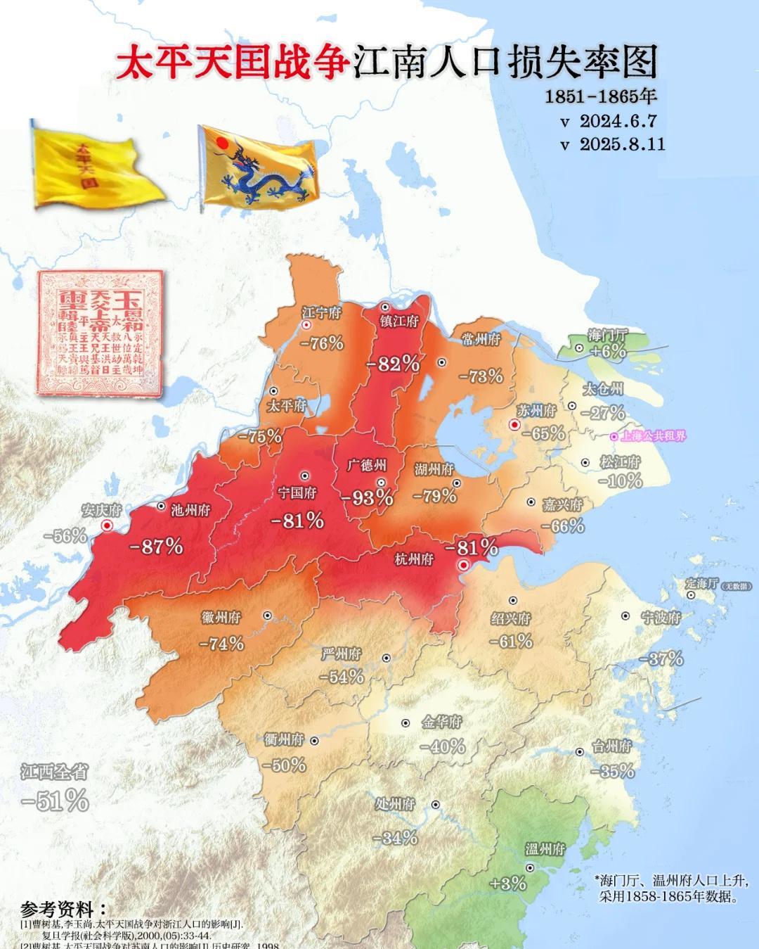 太平天国战争的江南人口损失率图: 太平天国运动这一场对峙,从广西开始一路向北打,打到了今天的南京附近,建立了太平天国。并且在整个江南地区,与满清政府的部队,打成了一片。太平天国起义军之所以占领江南地区,不就是因为江南地区,是大清最富饶的地区吗? 江南地区是鱼米之乡,但最终也是没能撑住,而太平天国运动,造成整个江南地区的人口剧减,最多的地方,人口的暴跌9成,10万人只能活下1万人。这样的惨状。在整个古代史上,都是难得一见的。 不管怎么说,太平天国运动到底是进步,还是后退,历史自有明断。后来已经是失败了,也就不去再多说什么了,太平天国到处都是封王,封了几万个王,注定了就不会成功。满清怎么不能打,到最后也没给汉族人封王,而且满清给自己的封王也很少。 至少在满清当个王爷,还是很有价值的,有含金量,而太平天国封了几万个王。太平天国的王,一点分量都没有,真的不值钱。到最后什么类似于队长级别的小人物,也能封王,这样打下去,大家都是王,没必要打了。 反正对于太平天国运动,现在宣传的也少。也不知道该怎么说,博主了解的也不多,反正博主只知道江南地区,因为太平天国运动,算是倒了大霉,人口少了太多,后续经过上百年发展,才重新出来的,也是真的不容易。