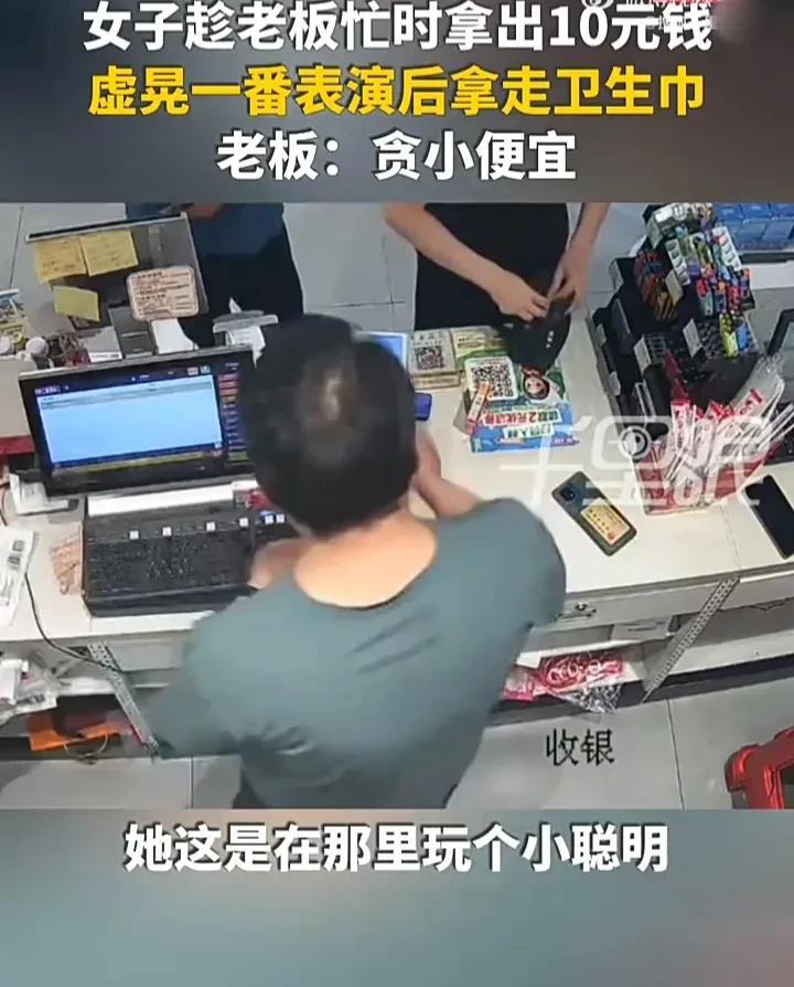 太爱贪小便宜了!8月17日,广东东莞一名女子到商店买卫生巾,趁着老板在帮另一位顾客结账时,她故意从包里拿出10元钱,在老板眼前晃了一眼就收回包里,然后跟老板说给过钱了,直到老板查询监控,才发现女子的花招,顿时很无语。
