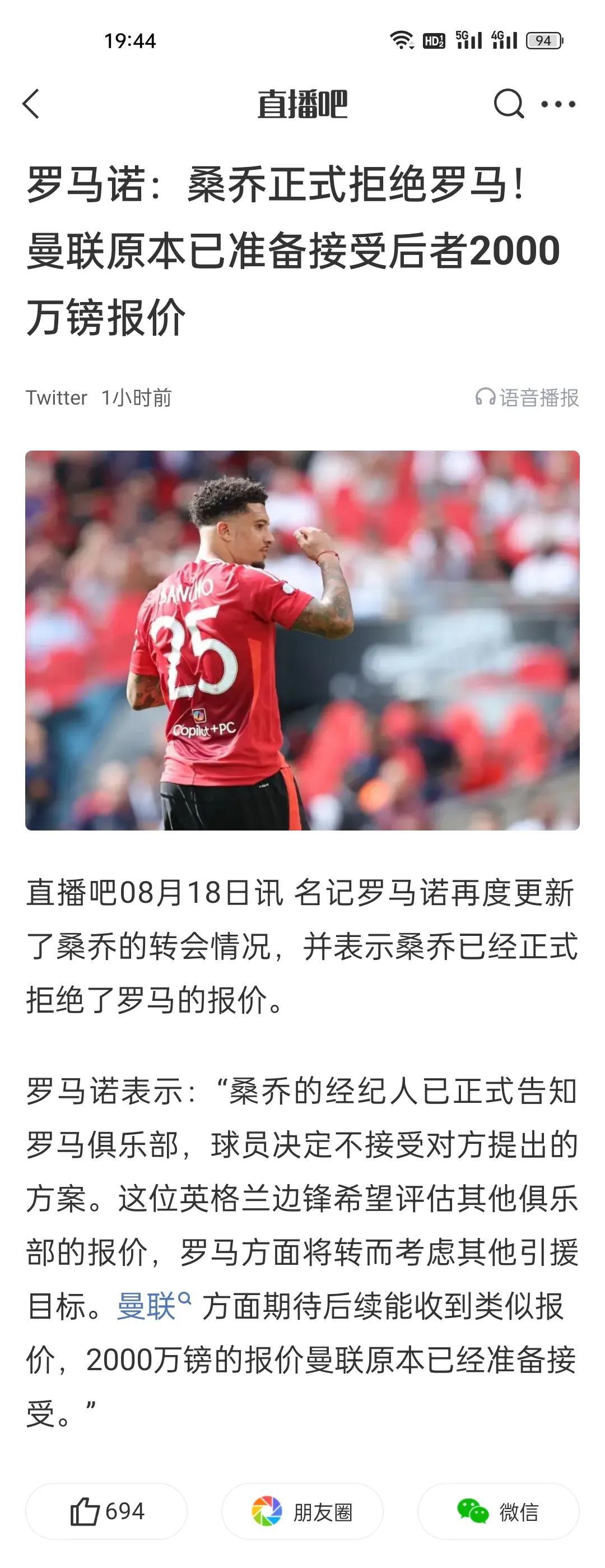 罗马诺:桑乔正式拒绝罗马!曼联原本已准备接受后者2000万镑报价。 他就是想要高薪,但是他也知道自己已经恢复不到过去的水准了,所以就在这卡着,目前看来直接卖掉他几乎没有可能了,能租出去就算烧高香了,而且还得是曼联承担部分薪水才能租出去的那种情况。 本来还能谈谈,你罗马居然要给核心,那桑宝肯定得撤了,不然真踢就得露馅了。