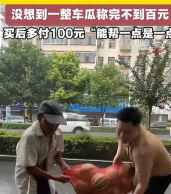 河南,男子不想让卖瓜老夫妻淋雨,包圆了一车西瓜。谁知西瓜3毛钱一斤,一整车才98元,男子于心不忍,又掏出钱包说:“再给100!”