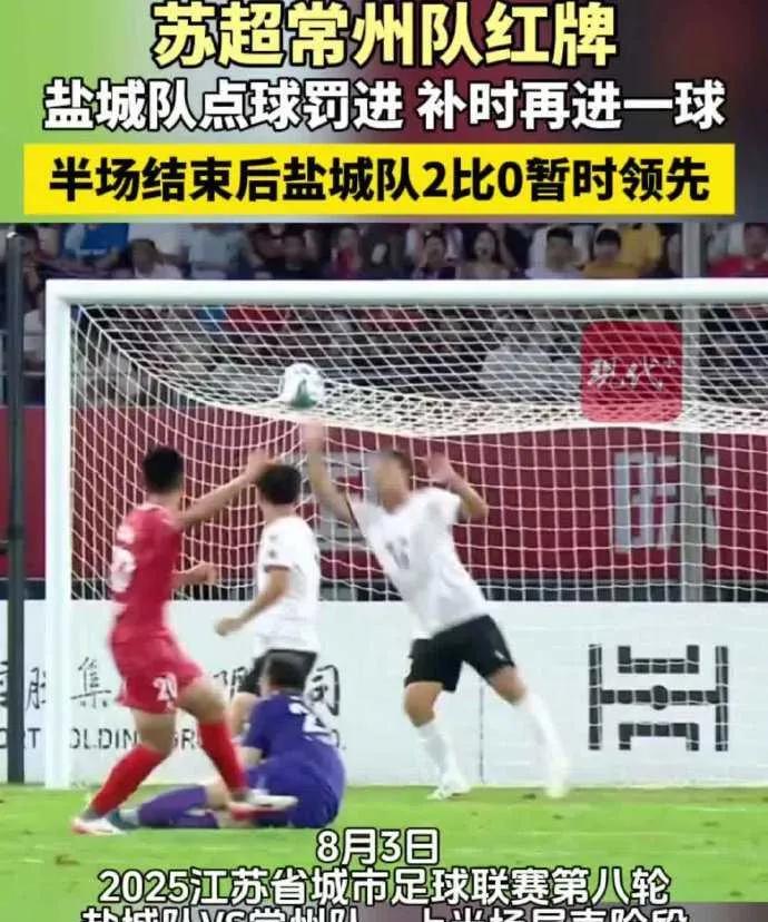 2025江苏城足联赛第8轮盐城战常州,上半场末常州手球染红,胡书铭罚进点球,盐城半场2球领先。