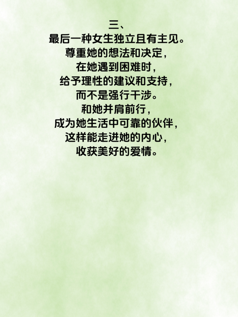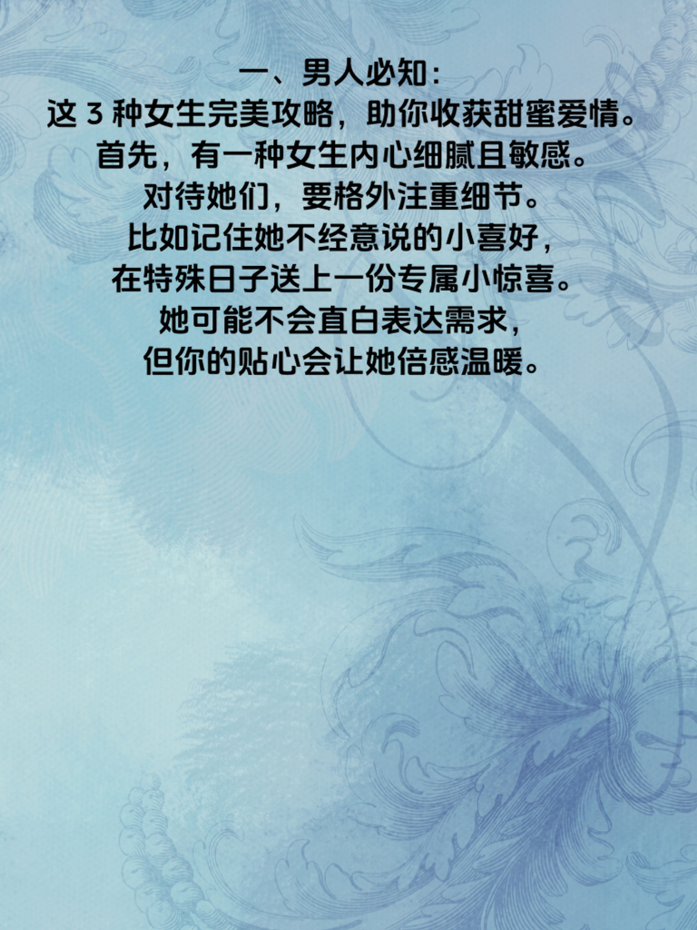 一、男人必知:这3种女生完美攻略,助你收获甜蜜爱情。首先,有一种女生内心细腻且敏感。对待她们,要格外注重细节。比如记住她不经意说的小喜好,在特殊日子送上一份专属小惊喜。她可能不会直白表达需求,但你的贴心会让她倍感温暖。 二、还有一类女生热情开朗,充满活力。和她相处,要积极回应她的热情,陪她一起去探索有趣的地方,参与各种活动。用你的活力感染她,共同创造更多欢乐回忆,让你们的相处充满阳光。 三、最后一种女生独立且有主见。尊重她的想法和决定,在她遇到困难时,给予理性的建议和支持,而不是强行干涉。和她并肩前行,成为她生活中可靠的伙伴,这样能走进她的内心,收获美好的爱情。