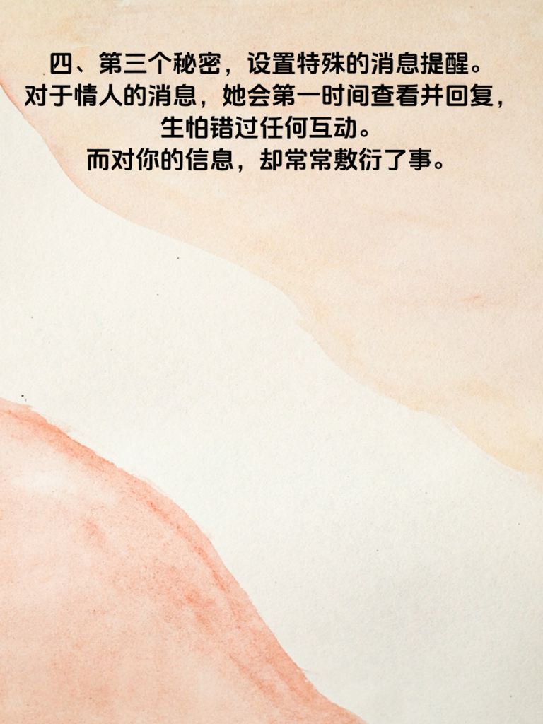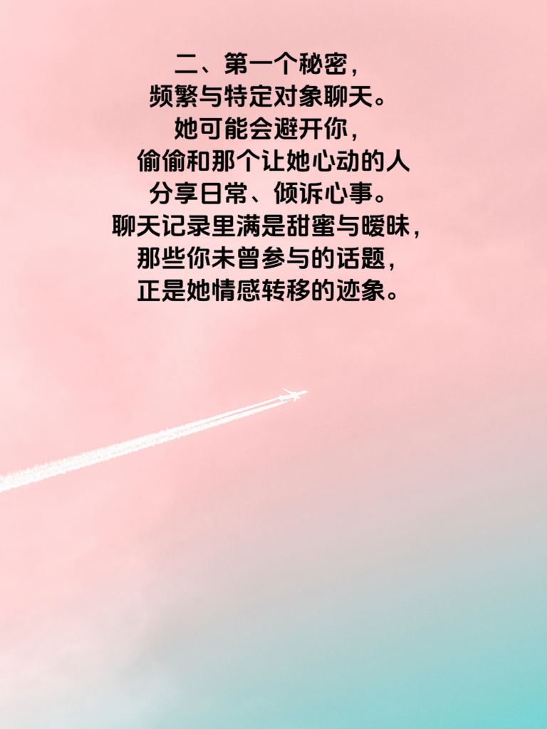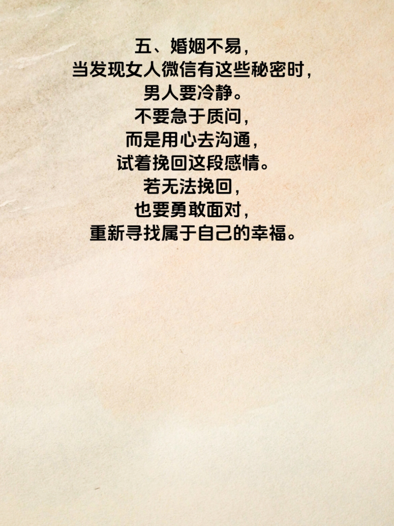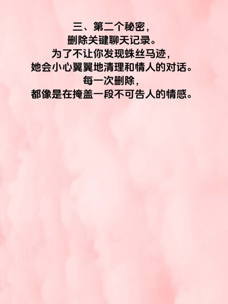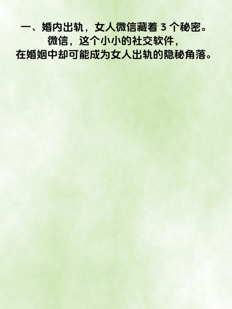 一、婚内出轨,女人微信藏着3个秘密。微信,这个小小的社交软件,在婚姻中却可能成为女人出轨的隐秘角落。 二、第一个秘密,频繁与特定对象聊天。她可能会避开你,偷偷和那个让她心动的人分享日常、倾诉心事。聊天记录里满是甜蜜与暧昧,那些你未曾参与的话题,正是她情感转移的迹象。 三、第二个秘密,删除关键聊天记录。为了不让你发现蛛丝马迹,她会小心翼翼地清理和情人的对话。每一次删除,都像是在掩盖一段不可告人的情感。 四、第三个秘密,设置特殊的消息提醒。对于情人的消息,她会第一时间查看并回复,生怕错过任何互动。而对你的信息,却常常敷衍了事。 五、婚姻不易,当发现女人微信有这些秘密时,男人要冷静。不要急于质问,而是用心去沟通,试着挽回这段感情。若无法挽回,也要勇敢面对,重新寻找属于自己的幸福。