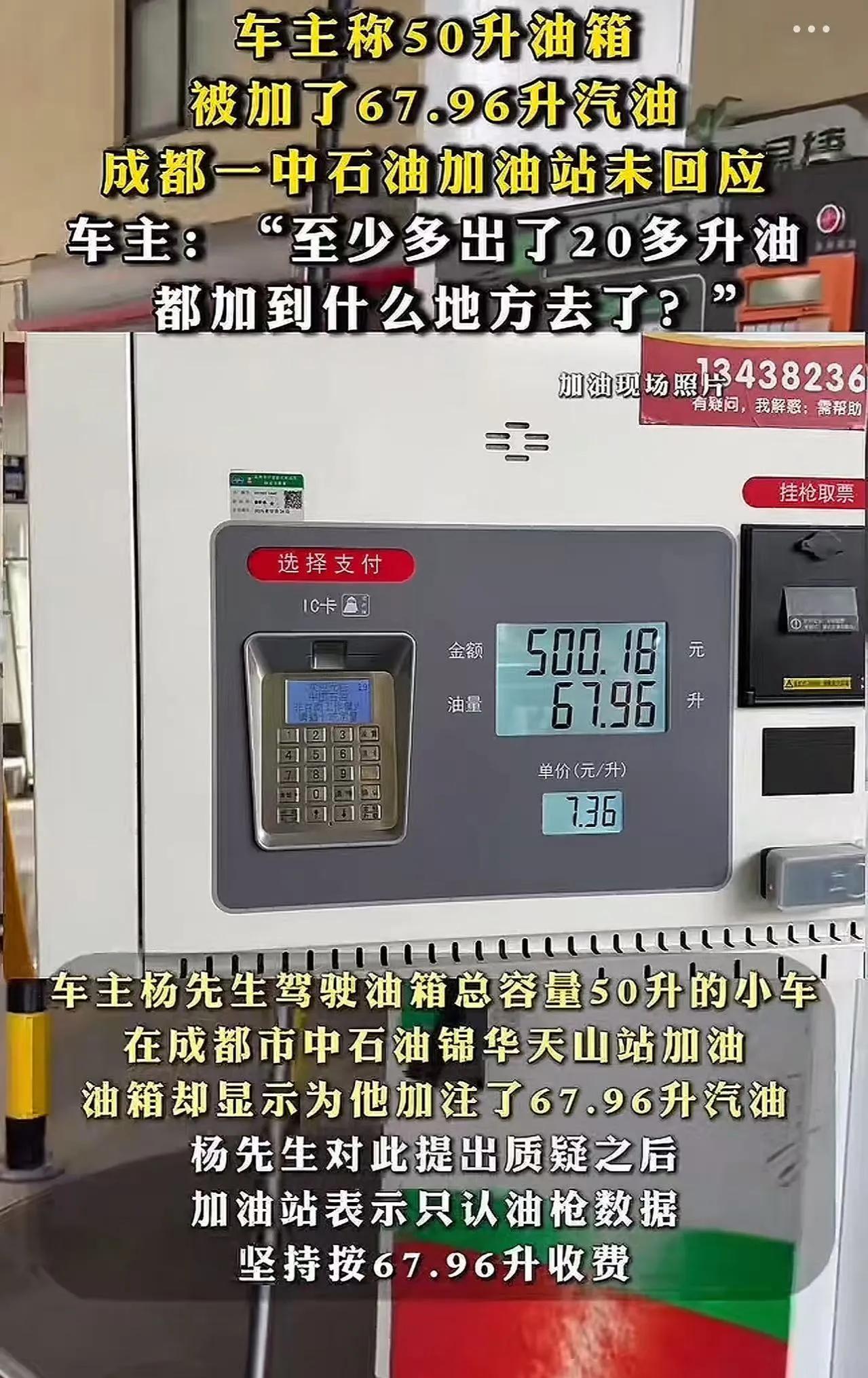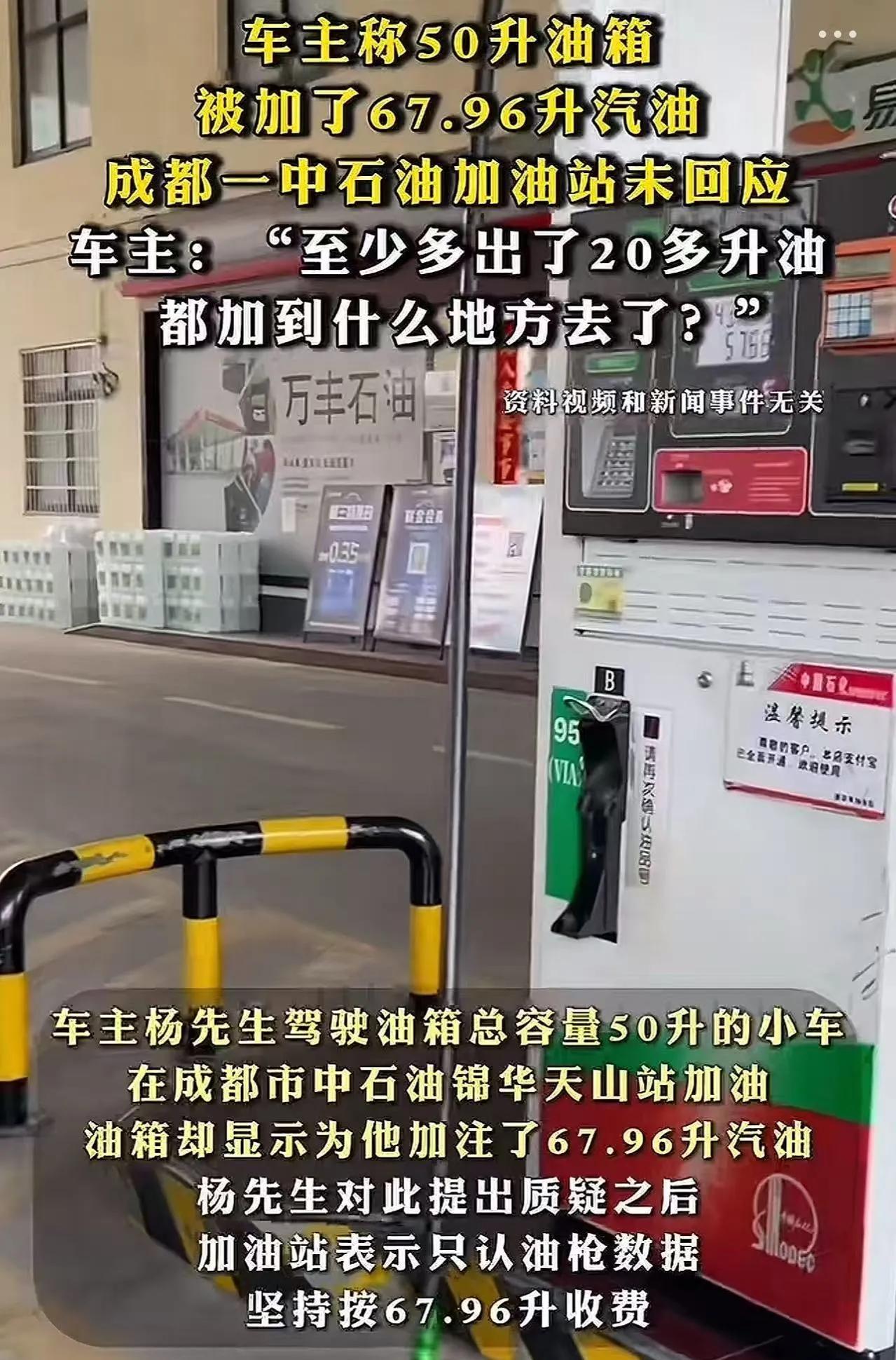 “20多升油到底加到哪儿了?”男子的车油箱设计最大容量就只有50L,却被加油站加