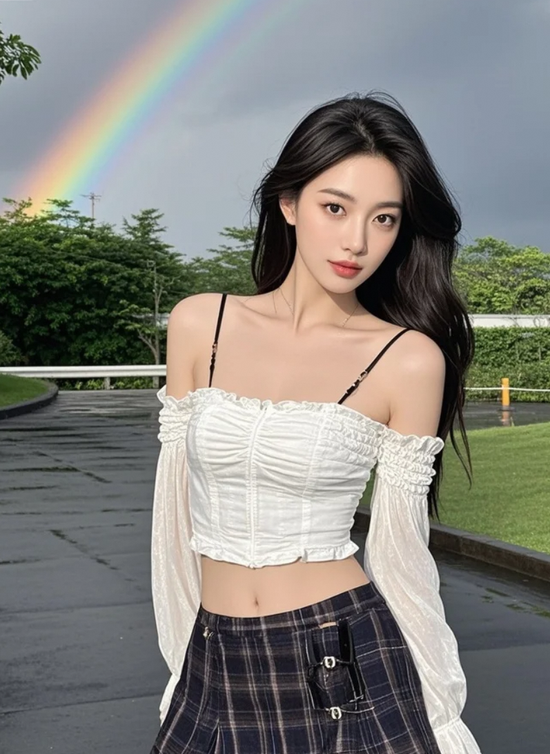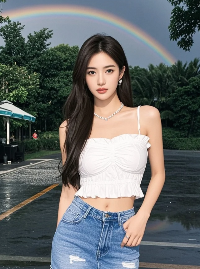 雨水洗净铅华,彩虹为幕,她便是天地间最纯粹的色彩。