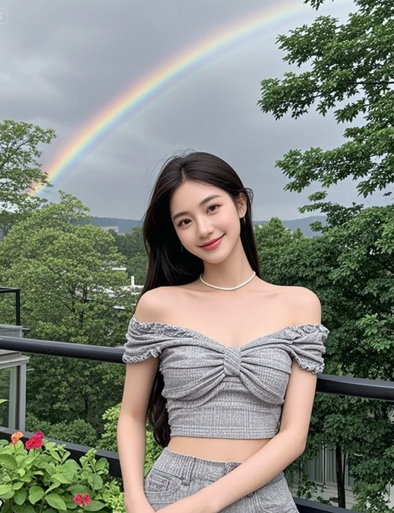 雨滴吻过花瓣,她站在虹桥尽头,笑靥比彩虹更摄人心魄。
