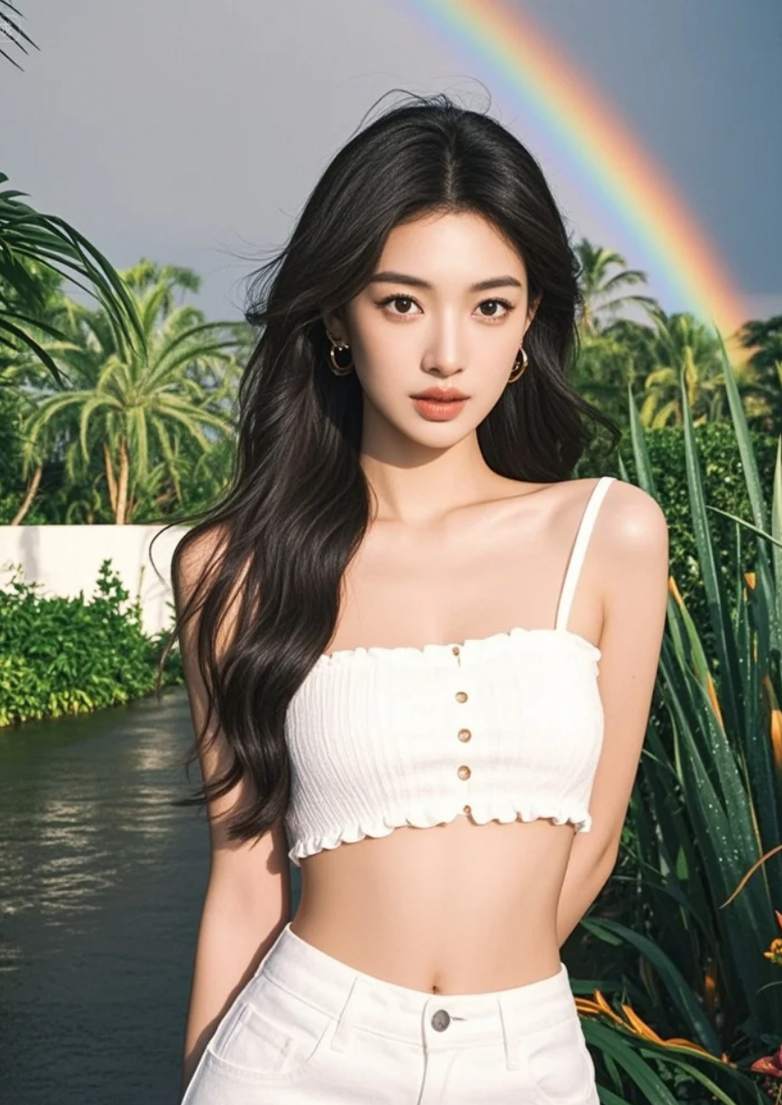 虹影渐隐,余晖微醺,她转身回眸,将整片雨后的浪漫定格。