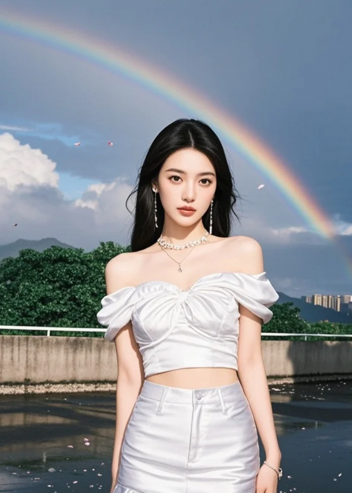 雨水洗净铅华,彩虹为幕,她便是天地间最纯粹的色彩。
