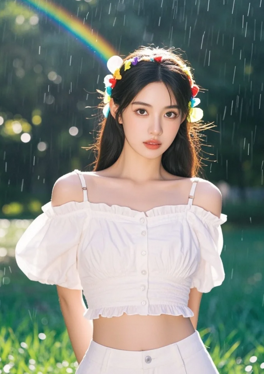 雨水洗净铅华,彩虹为幕,她便是天地间最纯粹的色彩。