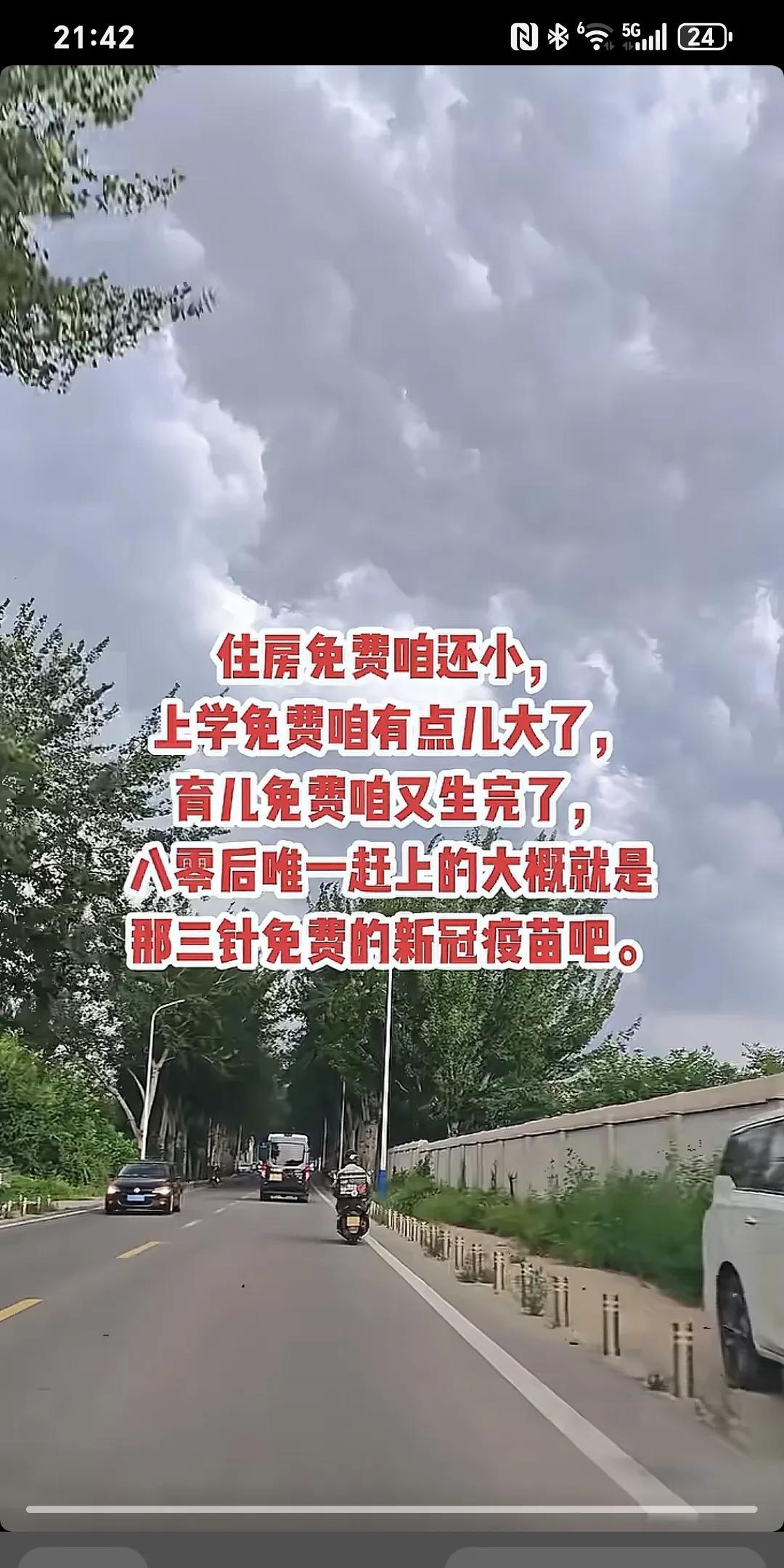 住房免费咱还小,上学免费咱有点儿大了,育儿免费咱又生完了,80后唯一赶上的就是,那三针免费的新冠疫苗吧。 还赶上了历史丄最高的房价,最高利率,就一个字“绝!” 八零后没有得到父母的爱,八零后的我们养出来的孩子不爱父母,终其一生,没有被爱。