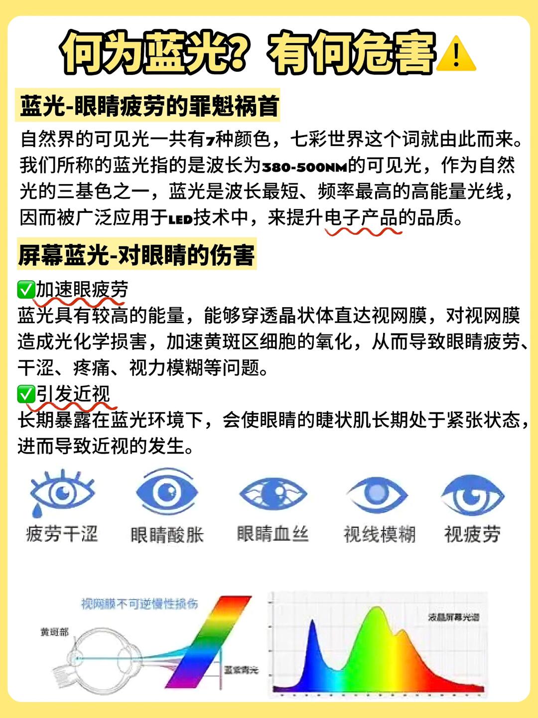 ✍️从光学原理来说,高能蓝光具有极强穿透性,能直接穿透角膜和晶状体,直达视网膜的黄斑区,长期照射会导致视网膜感光细胞受损,加速黄斑区老化,不仅会引发眼干、酸胀等即时疲劳,还可能让视力在不知不觉中下降,甚至增加干眼症、近视加深的风险!