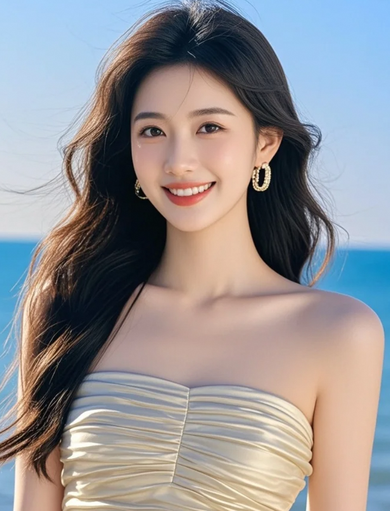一字肩+樱桃小嘴+发光皮肤!中长发飘逸,她站在海蓝中,美得像幅高级画!