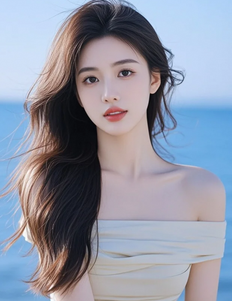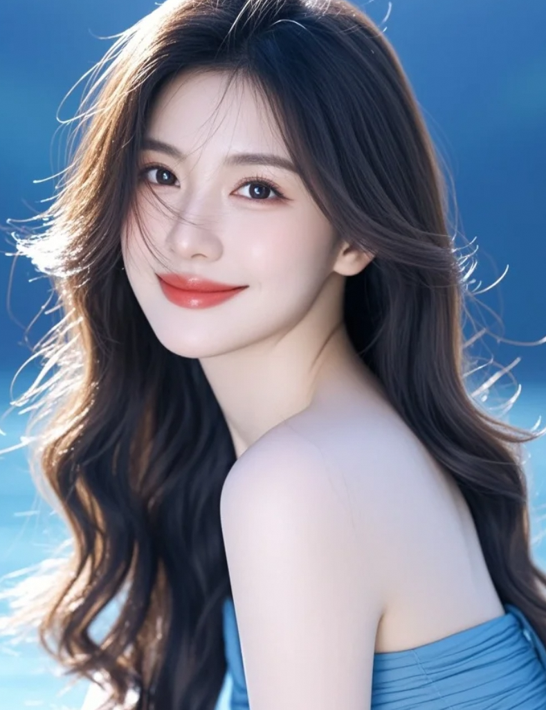 中长发如光垂落,樱桃小嘴微启,海蓝背景衬出她的高贵与秀气!
