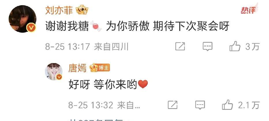 唐嫣为刘亦菲送生日祝福! 哇偶,两人的对话好甜呀,友谊之间的甜。好期待下次唐嫣和刘亦菲的聚会呀。 会选择在哪里呢? 茜茜公主和我糖,好可爱的称呼。