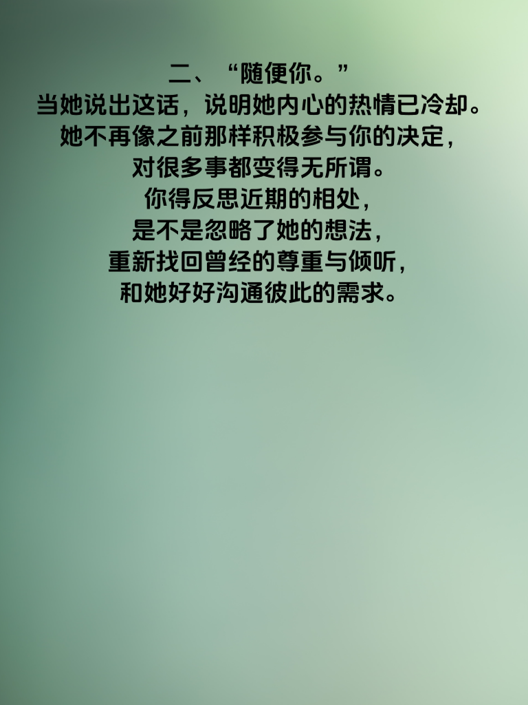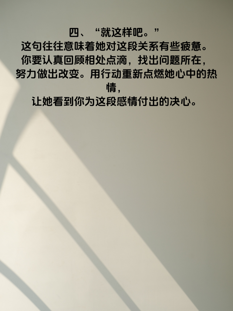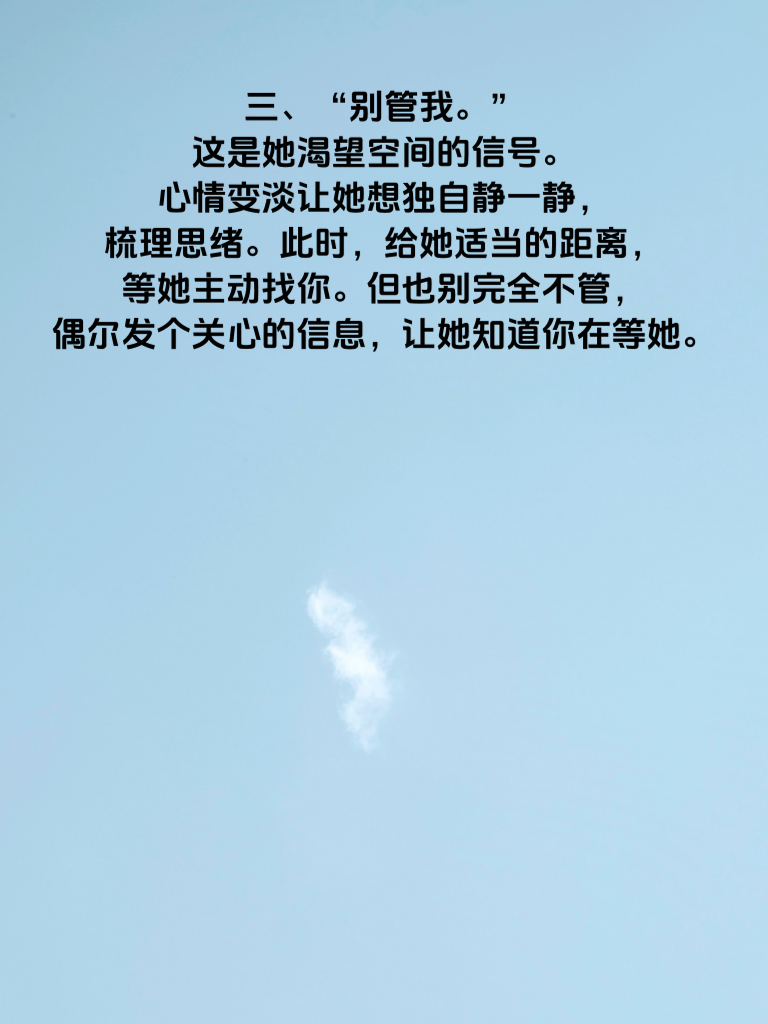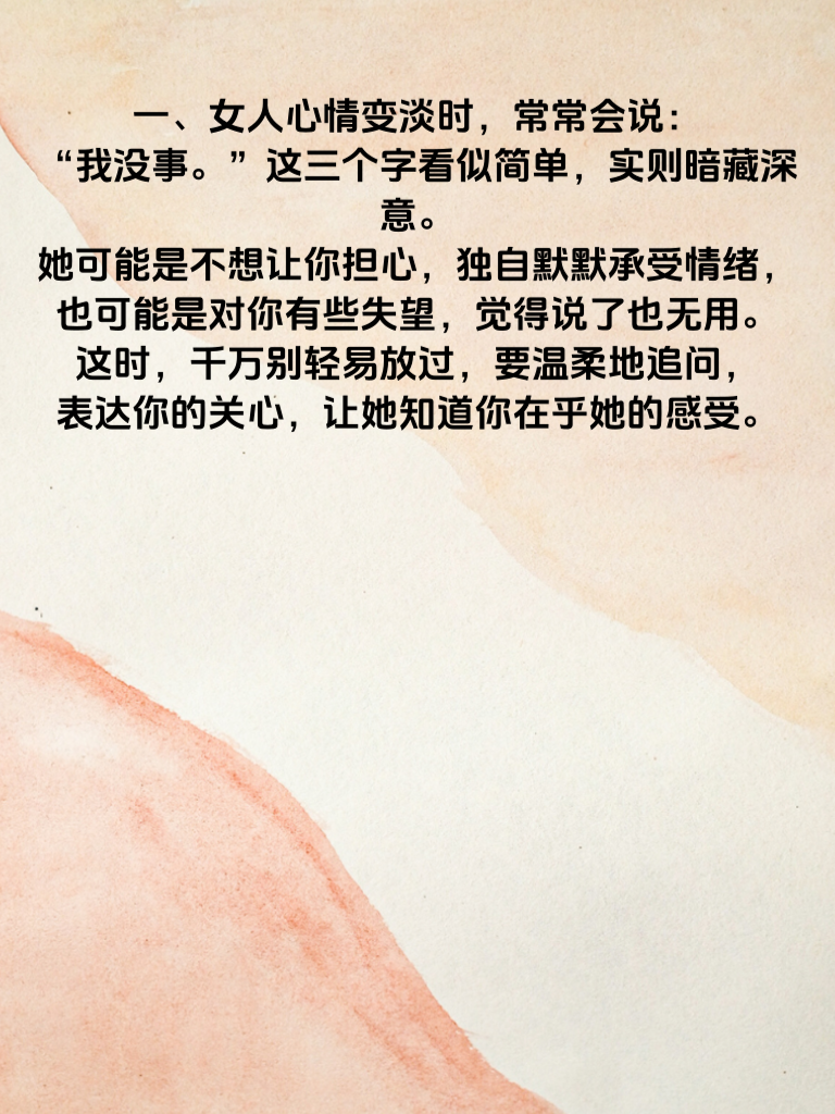 一、女人心情变淡时,常常会说:“我没事。”这三个字看似简单,实则暗藏深意。她可能是不想让你担心,独自默默承受情绪,也可能是对你有些失望,觉得说了也无用。这时,千万别轻易放过,要温柔地追问,表达你的关心,让她知道你在乎她的感受。 二、“随便你。”当她说出这话,说明她内心的热情已冷却。她不再像之前那样积极参与你的决定,对很多事都变得无所谓。你得反思近期的相处,是不是忽略了她的想法,重新找回曾经的尊重与倾听,和她好好沟通彼此的需求。 三、“别管我。”这是她渴望空间的信号。心情变淡让她想独自静一静,梳理思绪。此时,给她适当的距离,等她主动找你。但也别完全不管,偶尔发个关心的信息,让她知道你在等她。 四、“就这样吧。”这句往往意味着她对这段关系有些疲惫。你要认真回顾相处点滴,找出问题所在,努力做出改变。用行动重新点燃她心中的热情,让她看到你为这段感情付出的决心。