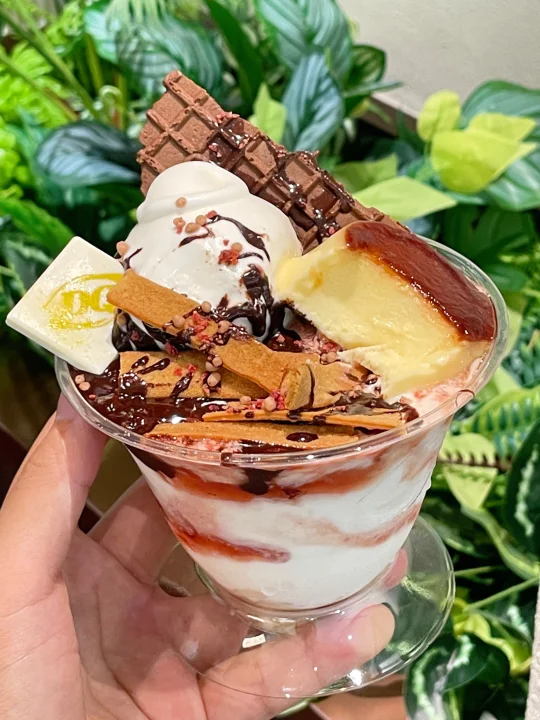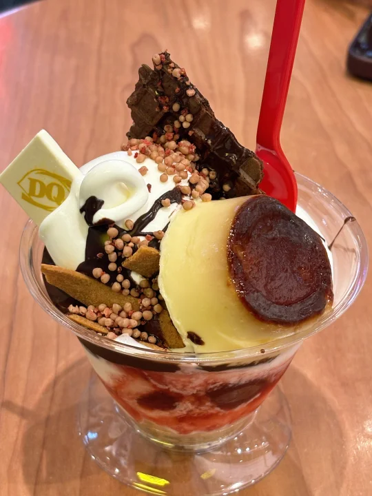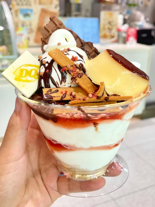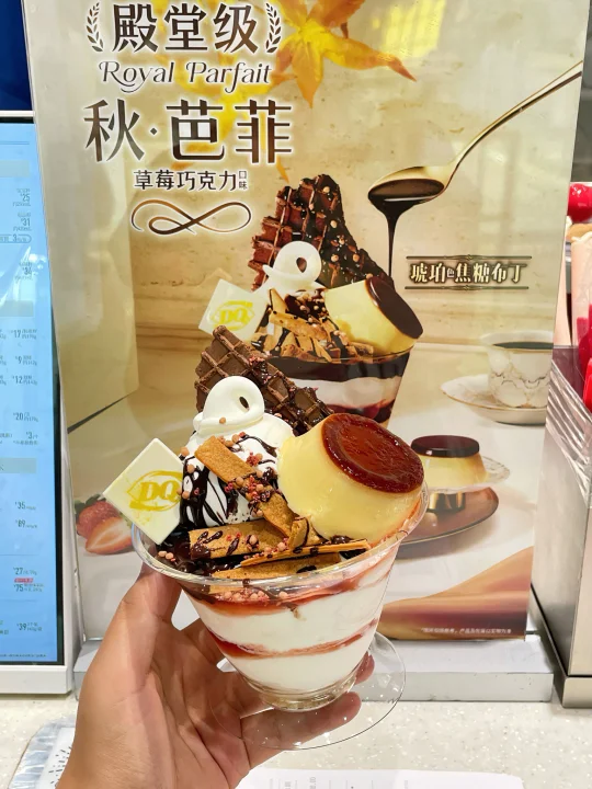 就是DQ这杯殿堂级 秋·芭菲!! 尊嘟很好吃!逛街随手买的冰淇淋!没想到一口惊艳! 顶上有一颗完整的焦糖布丁!口感很丝滑细腻!还有叶子红糖酥也很有特色,是特别酥脆的口感~一口下去能吃到冰淇淋和草莓酱!酸甜可口! 这杯是我近期的最爱,冰淇淋脑袋们一定要去试试!!😭