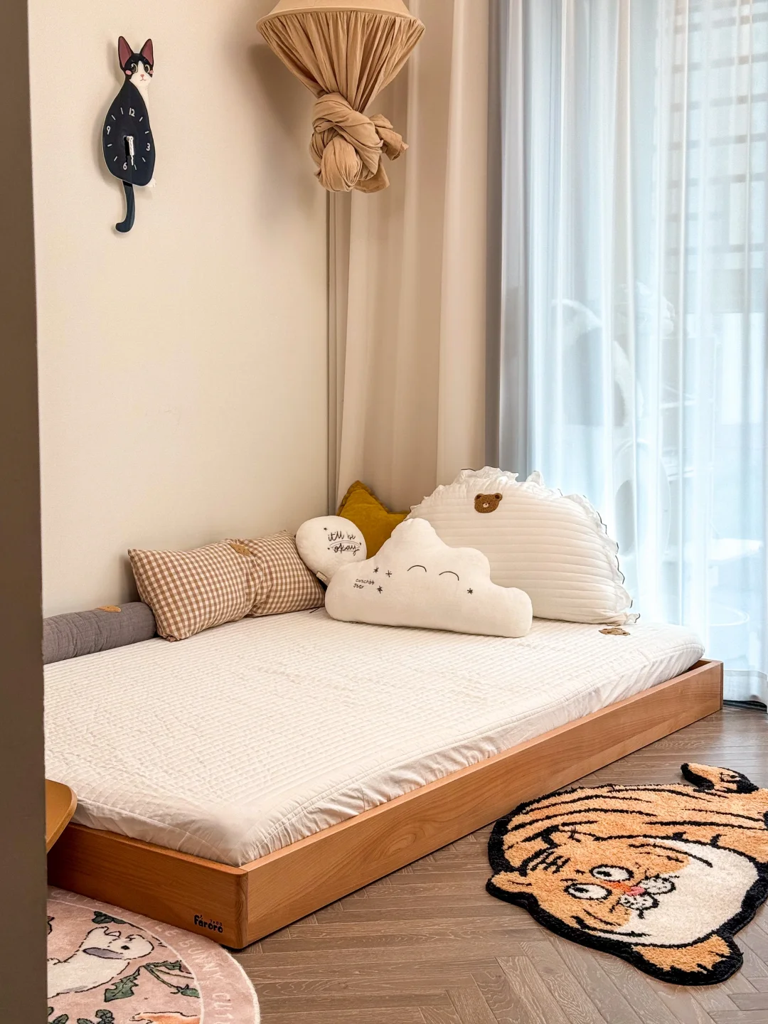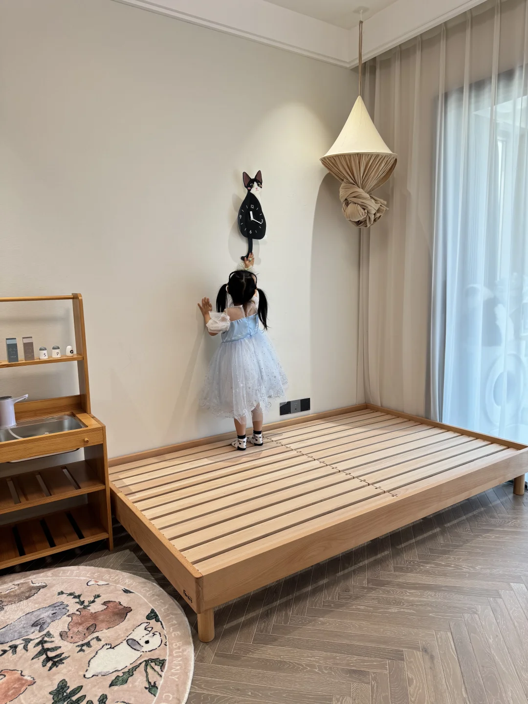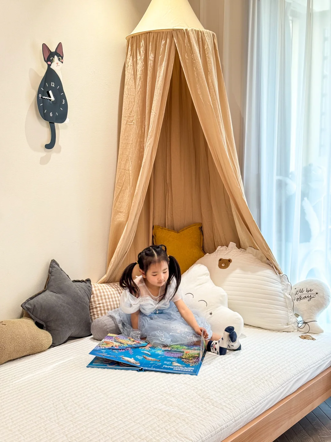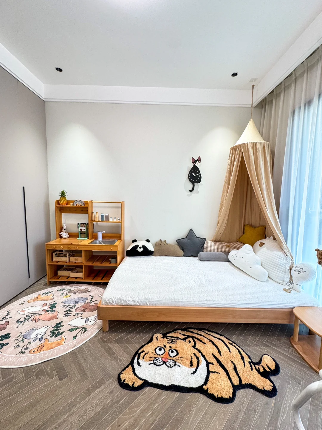 女孩房间只有9个平方 没有选择一成不变的榻榻米 而是根据孩子的需求不断调整房间布局 给快上幼儿园的姐姐选择了地台床 实木材质很安心、高度也适合 一岁的妹妹也不怕磕碰 实用、好看又好睡💤 将奶油色的墙壁挂上纱幔 小木床上堆满柔软的玩偶 阳光透过纱帘洒床前的地毯上 小黑板上画着歪歪扭扭的小花 小厨房上摆满了“美味佳肴” 女儿说,公主的城堡🏰就应该是这样吧 每次走进去,都忍不住羡慕…