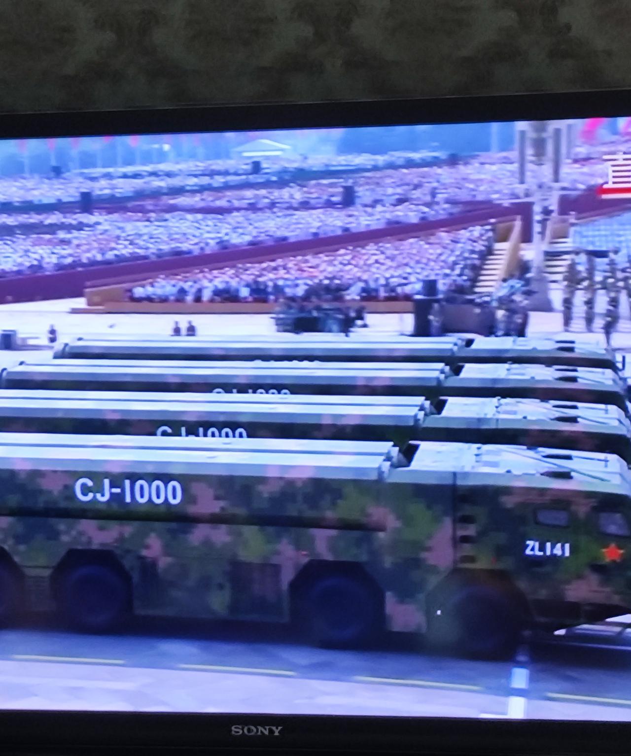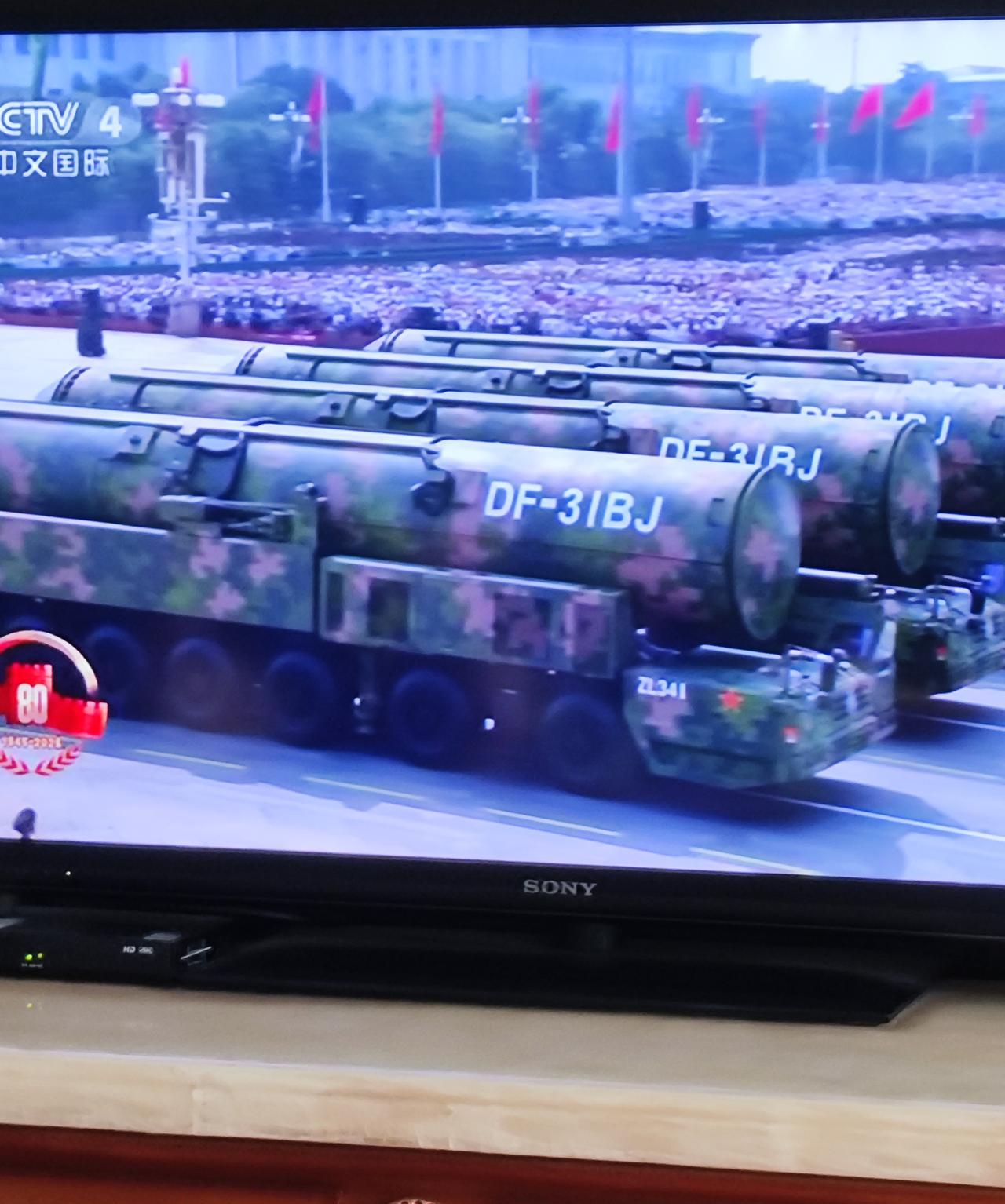 我自己拍的照片,真是太震撼了! 虽然我是老年人,虽然我不懂军事,但是看到这些武器装备,我也感到自豪和骄傲! 解说员那一句“可以覆盖全球任何角落”是听见了,我们的伟大祖国呀!你太强大了!所有中华儿女都为你自豪! 今天的阅兵相信全世界都在看,海外的华人们看到祖国的军事装备如此强大也是倍感欣慰吧! 这些大家伙有的第一次看到,看到这个老伴高兴的说太厉害了,没想到61出来了!