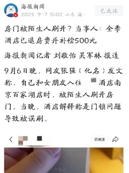 江苏南京,男子和女友入住某酒店463房间,一晚价格430元。晚上八点半,男子穿着内衣正坐在床上,女友也刚洗完澡穿好衣服,房门竟突然被刷开,关上后又再次被刷开,女友被吓得花容失色。原来,开门的是468房间客人,因为前台打的房卡小票不清晰,导致客人开错了房门。男子细思极恐,468的房卡怎么能开463的房门呢?他找到前台讨要说法,谁知,酒店的态度让人气愤。 说白了,酒店管理不到位,隐私安全全然不顾,这让人忍不住想问,酒店竟然能在这样一个私人空间里“任意开门”,到底是在保护客人,还是在方便自己“开门见客”? 这个故事发生在南京,一对情侣入住了某家酒店的463号房,房间价格430元,算是普通的中档酒店。 晚上八点半男方坐在床上,穿着内衣,女方刚洗完澡,也穿好了衣服,两人正打算享受一个平静的夜晚,可是谁知道房门突然被刷开了,虽然紧接着被关上,但没过多久又再次被刷开。 这下女方吓得花容失色,简直被吓坏了,原来这一切的始作俑者,竟然是住在468房间的客人。 这位客人按理来说应该是去开自己的房门,但由于前台给出的房卡小票不清晰,客人无意间把463房门给开了。 此时男方开始觉得事情不对劲,他想怎么会有房卡能同时打开两个不同的房间?这让他产生了严重的疑虑,不仅是关于酒店的管理,也关于个人的隐私安全。 于是男子找到前台进行询问,想要了解更多细节,毕竟房门莫名其妙地被打开,这不是小事,然而酒店的态度却让人更加气愤,似乎把问题的根源推给了“锁”。 但大家都知道,锁并不能背锅,问题的症结在于酒店本身的管理漏洞,酒店有各种卡,总卡、楼卡、楼层卡、房间卡等,虽然每种卡的权限不同,但在技术上是完全可以控制的,所以真正的问题在于酒店,完全不是锁的错。 如果在这个过程中,男女双方正处于隐私最为敏感的时刻,被突如其来的开门打扰,那种尴尬和不适是难以想象的,这不仅可能会让人感到羞愧,还可能造成心理上的负担,产生精神上的困扰。 如果因为这种侵扰,导致了长期的不安或心理阴影,甚至可能影响到两个人的关系,或者带来更严重的心理问题,酒店应当负有责任,应该在这类事件发生后及时采取措施进行赔偿,尤其是在精神损失方面,毕竟客人的隐私和安全,应该是酒店管理最基本的责任。 其实类似的事件并不罕见,有时候我们在享受旅途中的轻松时光时,忽视了安全隐私问题,酒店作为提供住宿服务的场所,除了要保证设施完备外,最重要的就是保障客人的隐私权,别让一个看似小小的疏忽,带来不可磨灭的影响。 最后你怎么看这件事?如果是你,遇到这样的情况,你会怎么处理呢?欢迎在评论区分享你的看法。