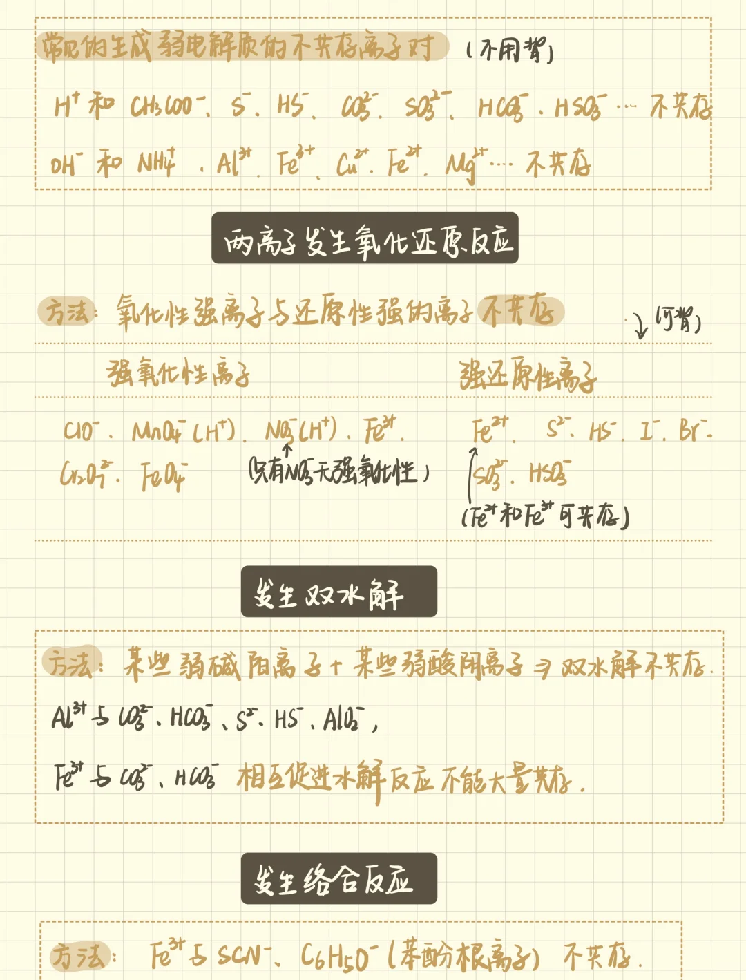 ✅离子共存不需要背那么多‼️一共四种大类型不共存:复分解反应、氧化还原反应、双水解、络合反应,依照这个顺序、将阴阳离子组合,不共存离子对就选出来了