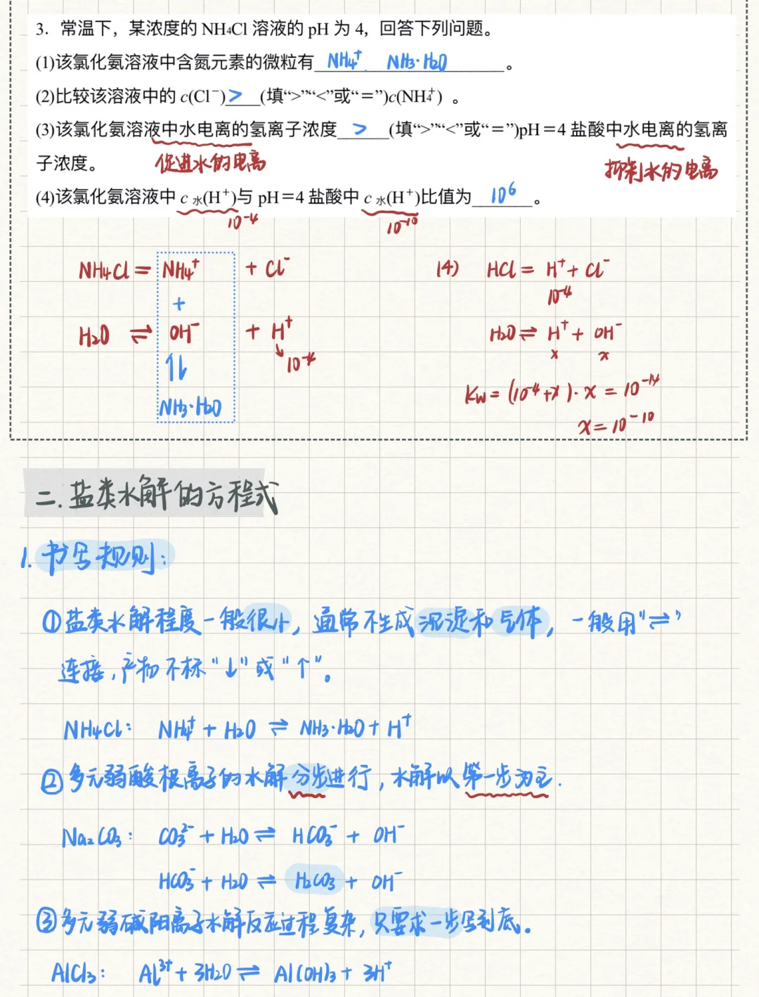 ✍️新的笔记来啦!今天更新的是盐类的水解,这节课会稍微有点难度。 ✍️本节课重点内容:水解的原理,判断盐类的酸碱性,水解方程式的书写,由水电离出的氢离子运算,酸式盐溶液酸碱性的分析🧐 ✍️每个知识点后面有对应习题,大家可以好好理解