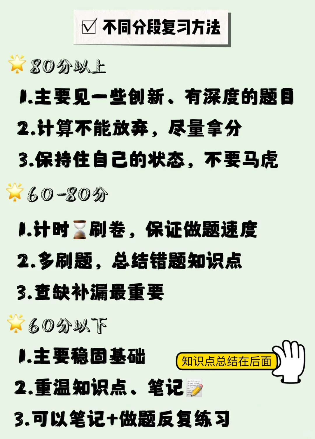2️⃣60-80分之间,要同时注重时间和答题质量,刷套卷计时⌛️,多练找手感,每次错误注意总结在小本子上,主要是查缺补漏