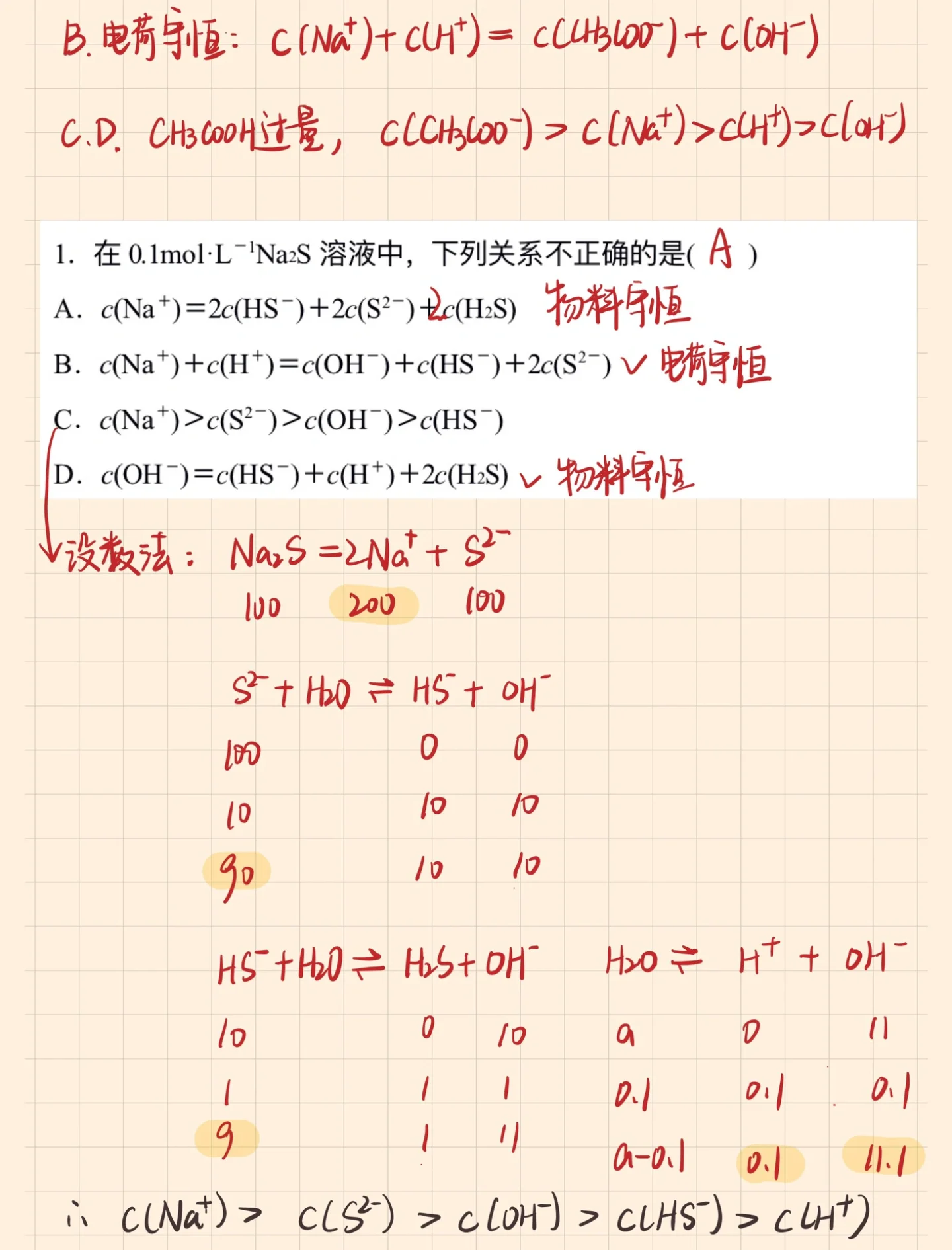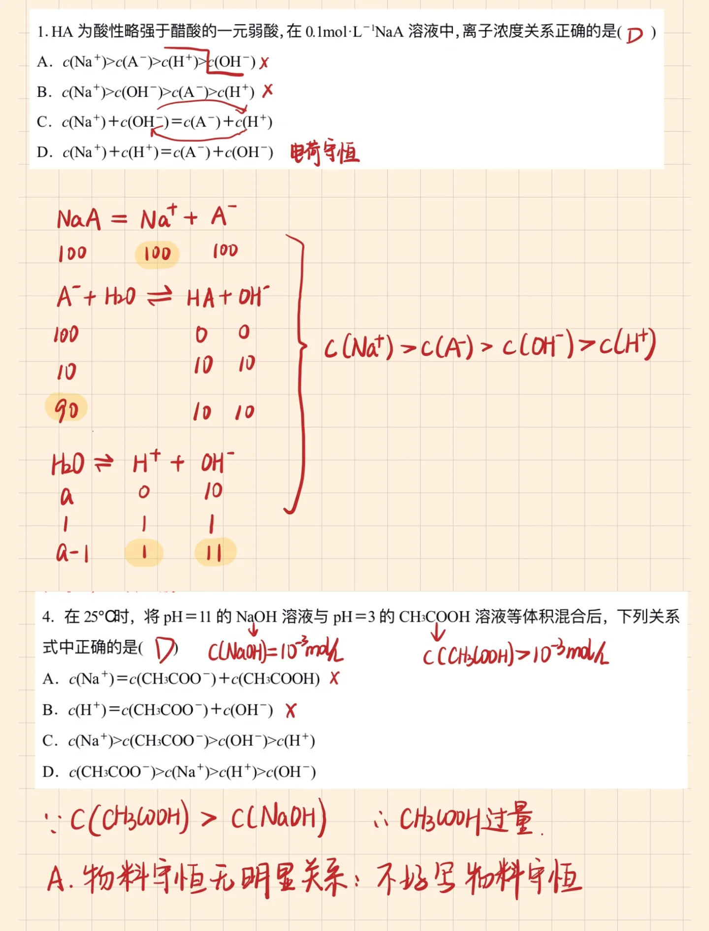 👩🔬首先要了解守恒原理,电荷、物料、质子守恒怎么写,不同溶液的应用。然后最重要的是做题的时候要能想到,看到选项中涉及到等式了,要去考虑三守恒