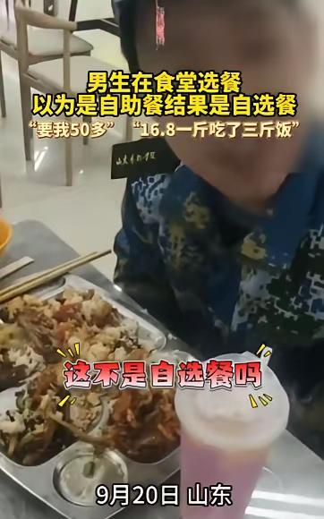 “这代价太大了!”山东,一名大一新生军训后到食堂吃饭,误把食堂窗口看成了自助餐,