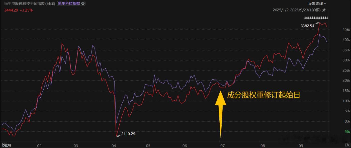 Choice数据显示,2025年6月30日起,恒生港股通科技指数的成分股权重上限扩大至15%后,指数年内走势开始迅速反超成分股权重上限最高8%的恒生科技指数。