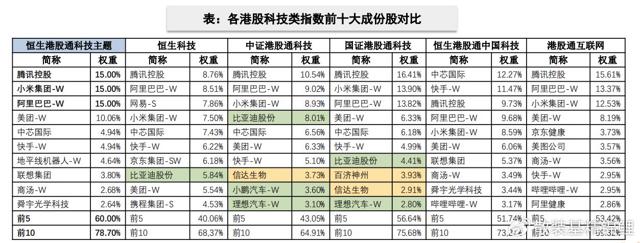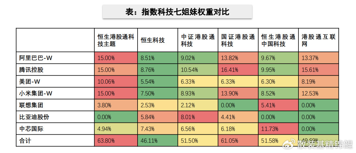 比照港股,根据华泰证券对七姐妹的定义,“港股科技七姐妹”指的是阿里巴巴-W、腾讯控股、美团-W、小米集团-W、联想集团、比亚迪股份、中芯国际。而恒生港股通科技主题指数成分股中上述“港股科技七姐妹”的合计持仓占比高达63.80%,含量显著高于其他同类指数。