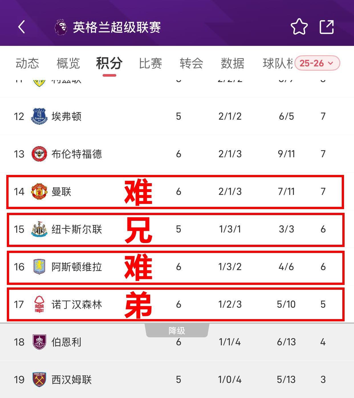 看了眼英超积分榜,曼联心里舒服多了!虽说六轮只有七分吧,但也没那么不堪啊。 曼联楼下的这三兄弟可都是欧战区的球队啊,今年混的比曼联还惨属实让人没想到。 这么看阿莫林还是有点东西的,至少曼联排在纽卡,维拉,森林上面。[偷笑] 不过曼联也不要高兴的太早。下面这几位一旦欧战解放了,就要往前面冲了,到那时候曼联可能真就要到倒数第四的位置了。 其实要是B费的2个点球要是都能罚进去,可能曼联都能在前6了,所以都赖B费这个扫把星。
