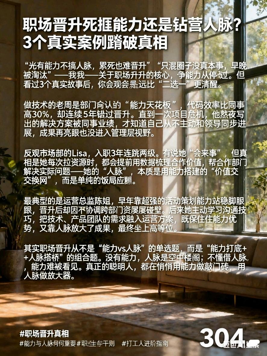 职场晋升死磕能力还是钻营人脉?3个真实案例戳破真相 “光有能力不搞人脉,累死也难晋升”“只混圈子没真本事,早晚被淘汰”——关于职场晋升的核心,能力和人脉的争论从未停过。但看过3个真实故事后,你会发现答案远比“二选一”更清醒。 做技术的老周是部门公认的“能力天花板”,代码效率比同事高30%,却连续5年错过晋升。直到一次项目危机,他熬夜写出的解决方案被同事业绩,才知道自己从不主动和领导同步进展,成果再亮眼也没进入管理层视野。 反观市场部的Lisa,入职3年连跳两级。有人说她“会来事”,但真相是她每次拉资源时,都会提前用数据梳理合作价值,帮合作部门解决实际问题——她的“人脉”,本质是用能力搭建的“价值交换网”,而非单纯的饭局应酬。 最典型的是运营总监陈姐,早年靠超强的活动策划能力站稳脚跟,晋升后却因不懂协调跨部门资源屡屡碰壁。后来她主动学习沟通技巧,把技术、产品团队的需求融入运营方案,既保住了能力优势,又靠人脉放大了成果,最终坐上高管位。 其实职场晋升从不是“能力vs人脉”的单选题,而是“能力打底+人脉搭桥”的组合题。没有能力,人脉是空中楼阁;不懂借人脉,能力难被看见。真正的聪明人,都在悄悄用能力做敲门砖,用人脉做放大器。 职场晋升真相 能力与人脉哪个重要 职场生存法则 职场干货分享 打工人进阶指南 职场人脉价值 职场晋升考量 职场晋升秘诀