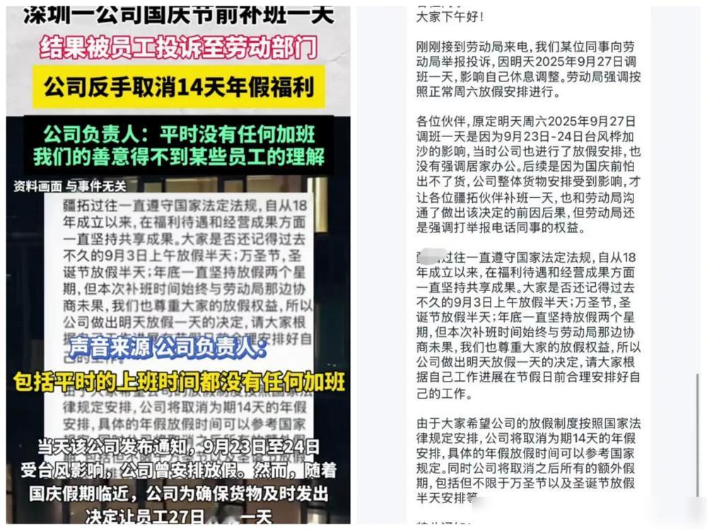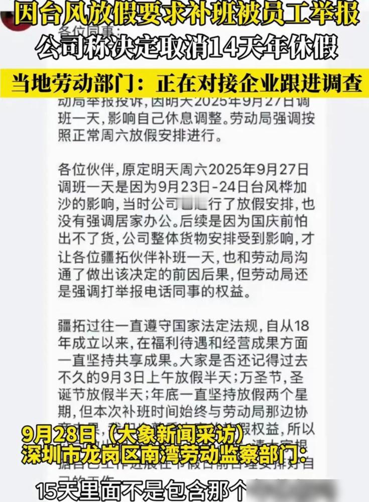 员工举报深圳疆拓公司调休一天,后续公司被曝出更多实情。最近这事儿在深圳打工人圈里讨论挺多——原本公司因台风耽误工期,想让9月27日(周六)补班一天,结果被员工投诉到劳动部门。结果呢,公司不仅取消了补班,还调整了放假制度,直接把原本每年14天的年假福利,连带着万圣节、圣诞节这些额外假期全取消了。 说句实在话,作为在深圳上了十几年班的人,挺能理解两边的委屈。员工觉得周末该休息,调休影响生活,维权没错;可公司也冤啊,台风天没让居家办公已经算照顾,补班也是为了赶进度。更关键的是,这公司之前福利真不差:春节放14-15天全薪假,各种节日还额外给假,在深圳算“别人家的公司”了。 现在好了,员工诉求满足了,可原本那些“超法定”的福利也没了。就像网友说的“求锤得锤”——合规是合规了,但少了这些额外的“甜”,打工人真的更开心吗?职场里,维权是权利,但也得想想:那些超出法定的福利,是公司愿意分享的善意。没了善意,只剩规矩,最后受伤的可能还是咱自己。 信息来源:媒体报道