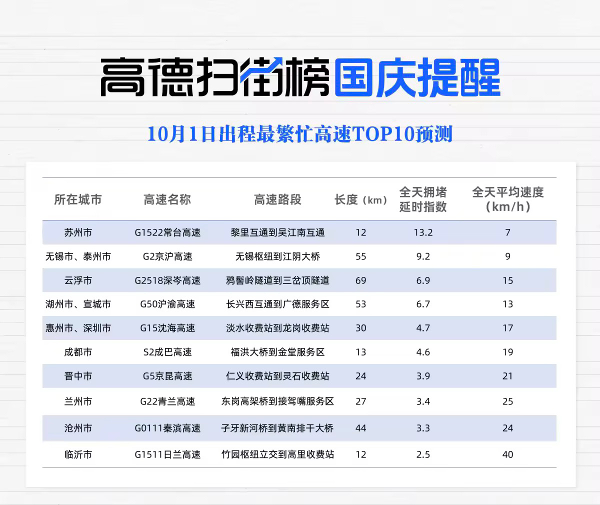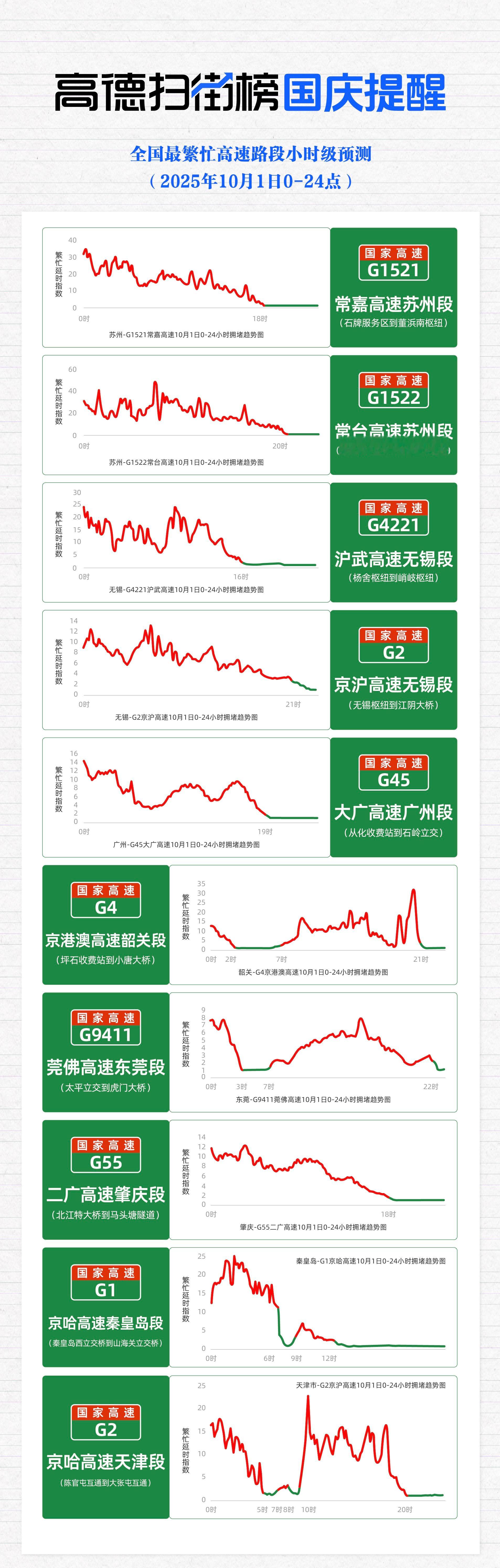 双节撞上了,今年长假期估计又要堵爆了。不过高德已经精准预测出今晚零点十大最繁忙的高速路段,不知道准不准。