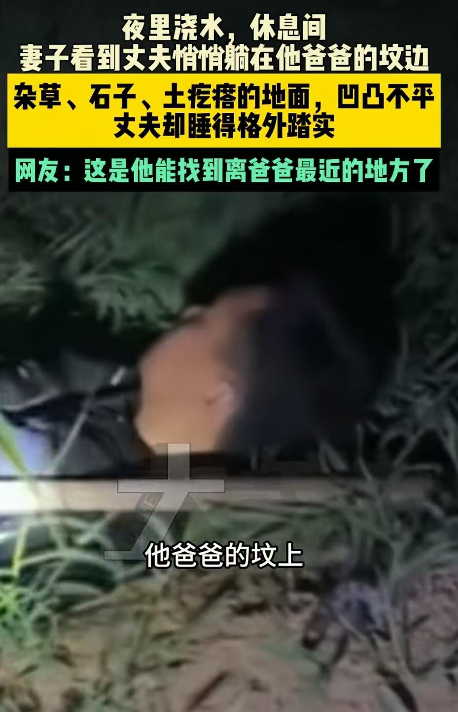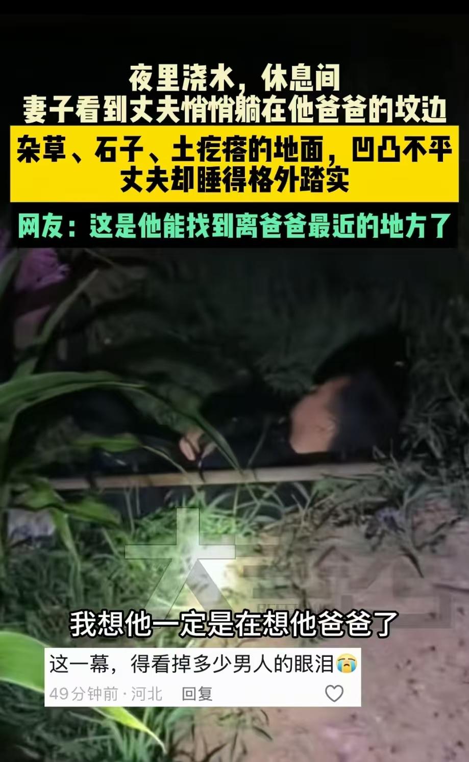 这一幕,看得人心头泛酸!河北,妻子夜里起来给地里浇水,却看到丈夫躺在公公的坟边睡