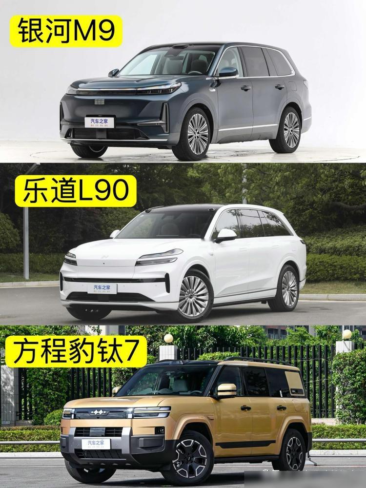 都是18万不到的起售价,其实优缺点很明显! 最近看了三款热门SUV的价格和配置,有点意思。银河M9现在限时优惠17.38万起,乐道L90租电17.98万起,方程豹钛7直接17.98万起。但细品下来,各有各的小毛病——银河M9同价位配置最基础,乐道L90每月得掏近千块电池租金,钛7尺寸最小还只有5座。 不过优势也挺突出。银河M9胜在性价比,限时优惠还能免费升级音响、电动踏板,老客户置换还有补贴,实际落地没比预售价贵多少,多孩家庭长途出行,1500km综合续航和第三排920mm腿部空间确实实在;乐道L90换电方便,纯电续航高,开起来悬架紧致,行驶质感不错;钛7通过性强,玩越野或者走烂路更省心,适合喜欢户外的朋友。 其实选车还是得看需求。预算紧、顾家的,银河M9更实在;在意补能效率、城市通勤多的,乐道L90换电是个加分项;要是爱折腾、喜欢自驾,钛7的5座和通过性更对胃口。 综合近期车市评测及用户反馈。