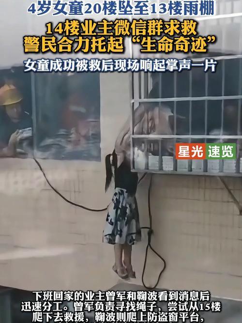 这场惊魂一刻,瞬间点燃了无数人的心弦,也让我们再次反思生命的脆弱与奇迹的存在。那一声“砰”,仿佛敲响了城市高楼之间的生命警钟,也让所有在场的人都屏住了呼吸。谁能想到,站在14楼的女子,面对突如其来的危机,会做出如此惊心动魄的举动?她的反应,像是一场生死瞬间的考验,也折射出人性中最真挚的善良与勇敢。 事发瞬间,女子跑去一看,眼前的一幕让她腿都软了——20楼的小女孩竟然从天而降,坠落到13楼的雨棚上。那一刻,